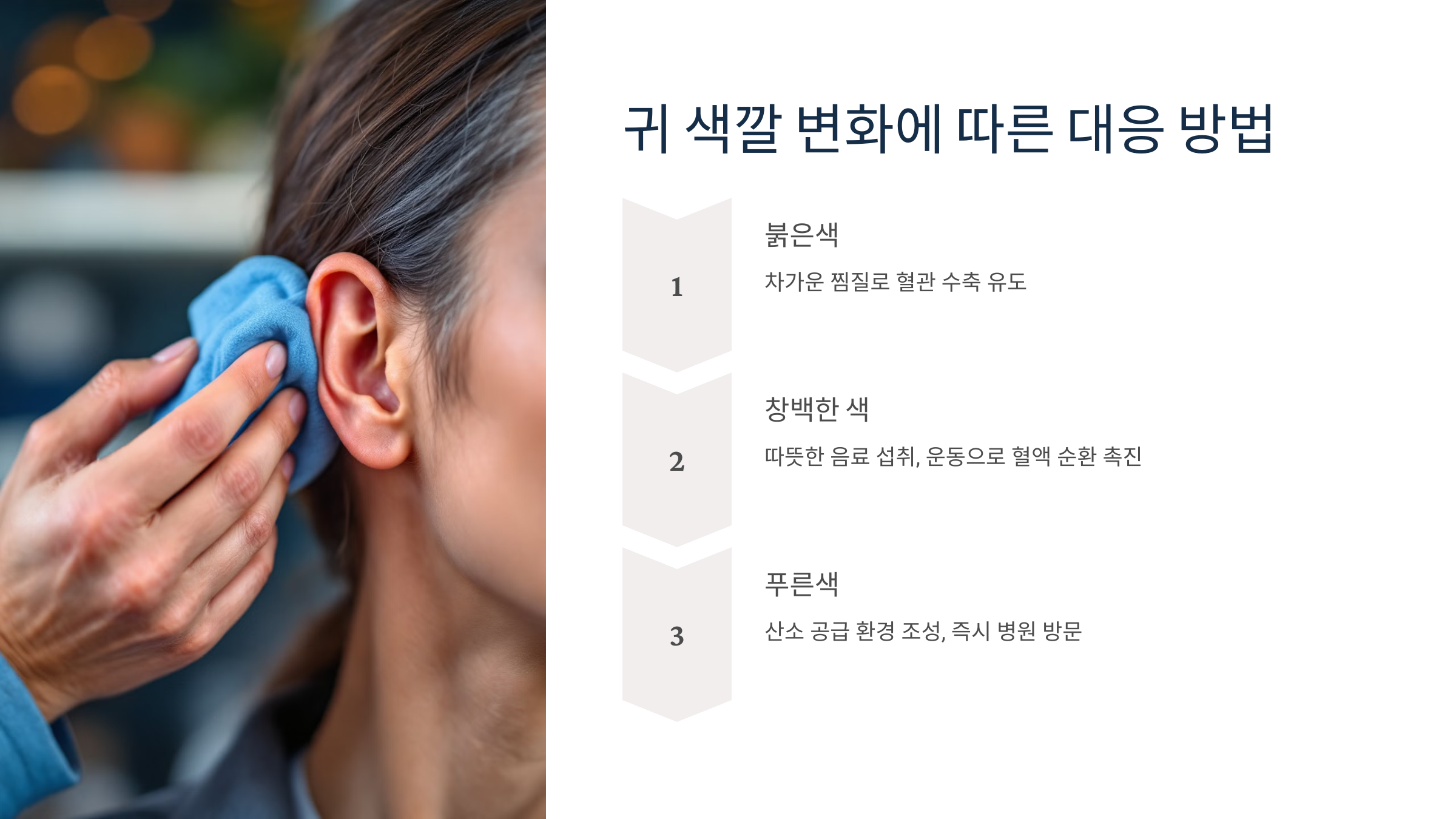 | 붉은색 | 차가운 찜질 | 열감이 심할 경우 귀를 차갑게 해주어 혈관 수축 유도 |