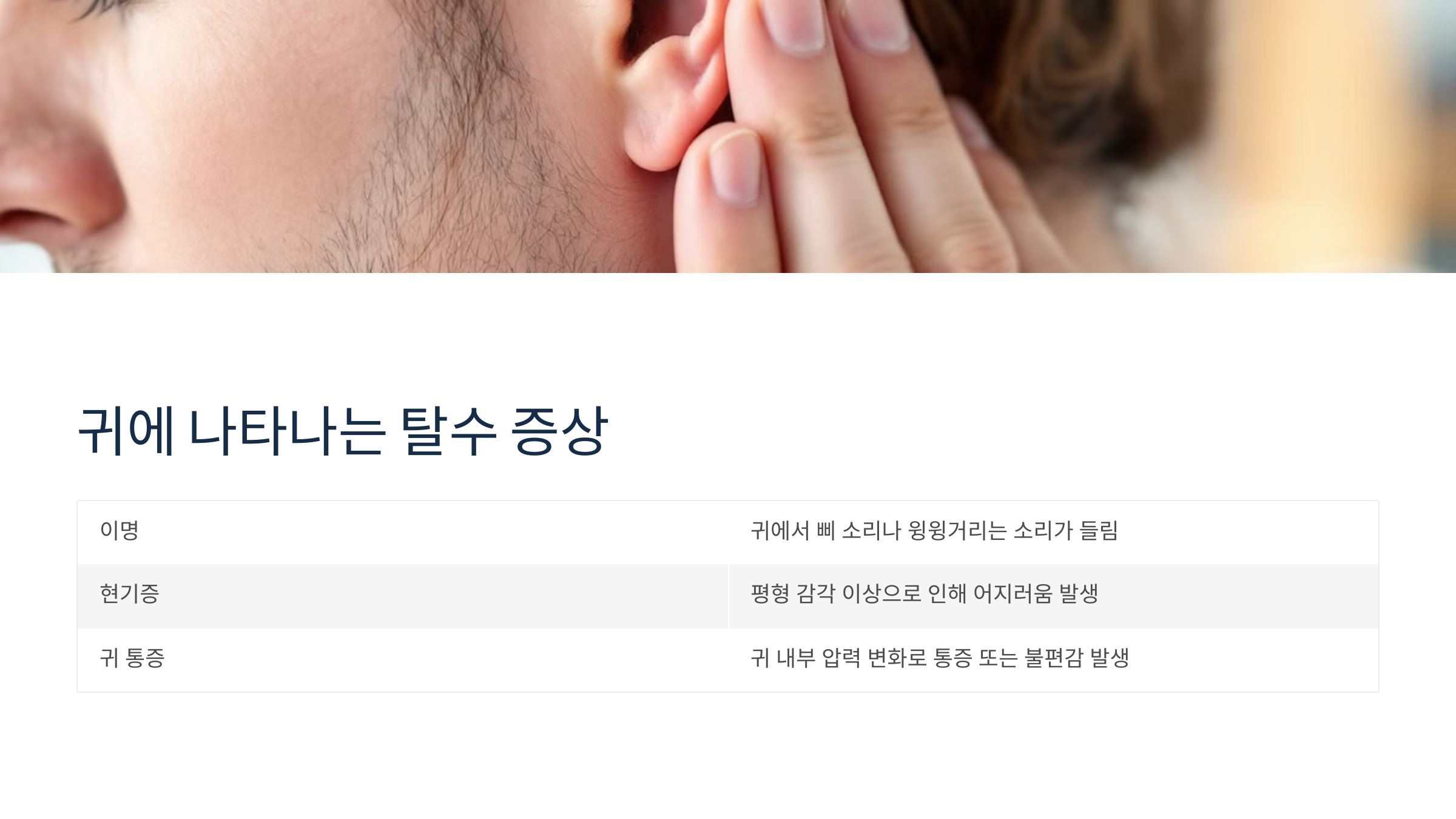 탈수로 인해 나타날 수 있는 귀 관련 증상들을 표로 정리했습니다. 이러한 증상은 단순 피로감으로 오해하기 쉽지만, 체내 수분 부족이 원인일 수 있습니다.