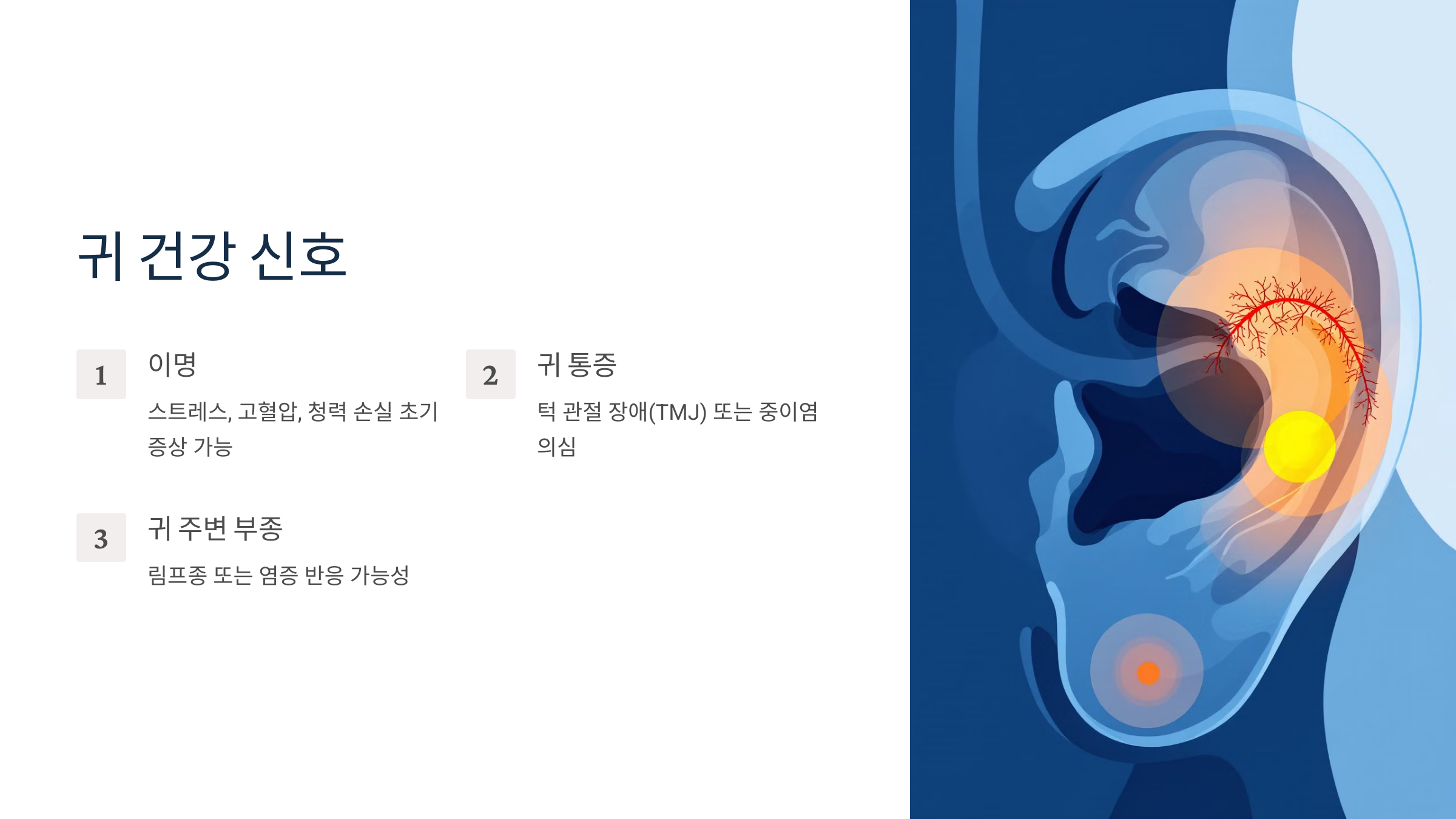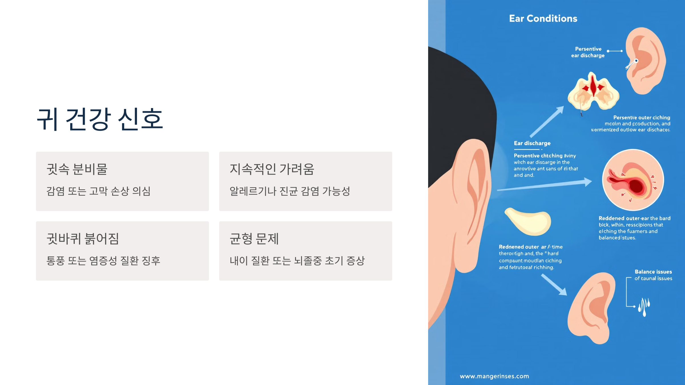 귀는 단순히 청력을 위한 기관이 아니라, 우리 몸의 건강 상태를 보여주는 중요한 창입니다. 작은 신호도 무시하지 말고 전문적인 검진을 통해 건강을 유지하세요! 🩺