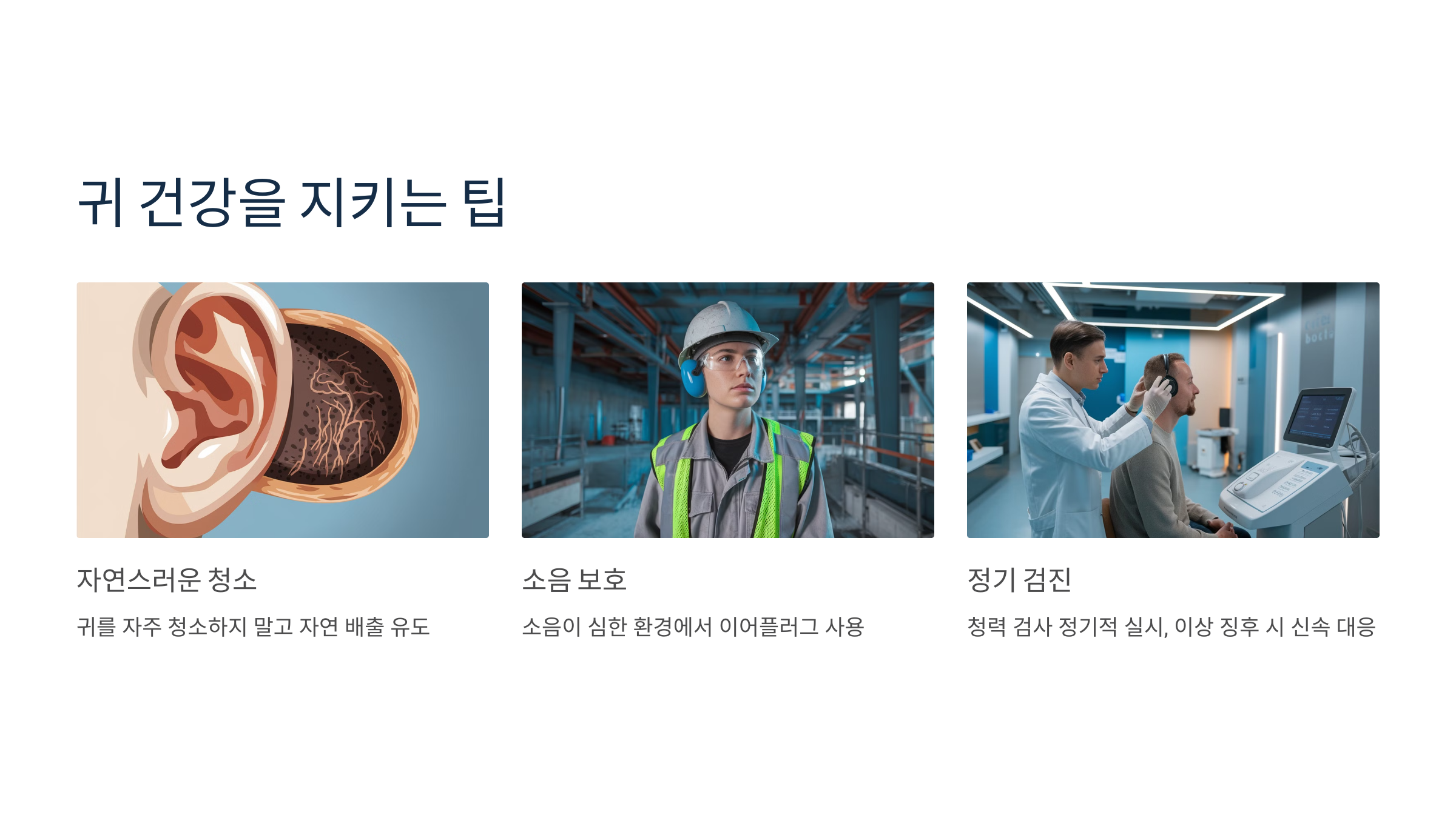 - 정기적으로 청력 검사를 받고, 이상 징후가 있으면 신속히 병원을 방문하세요.