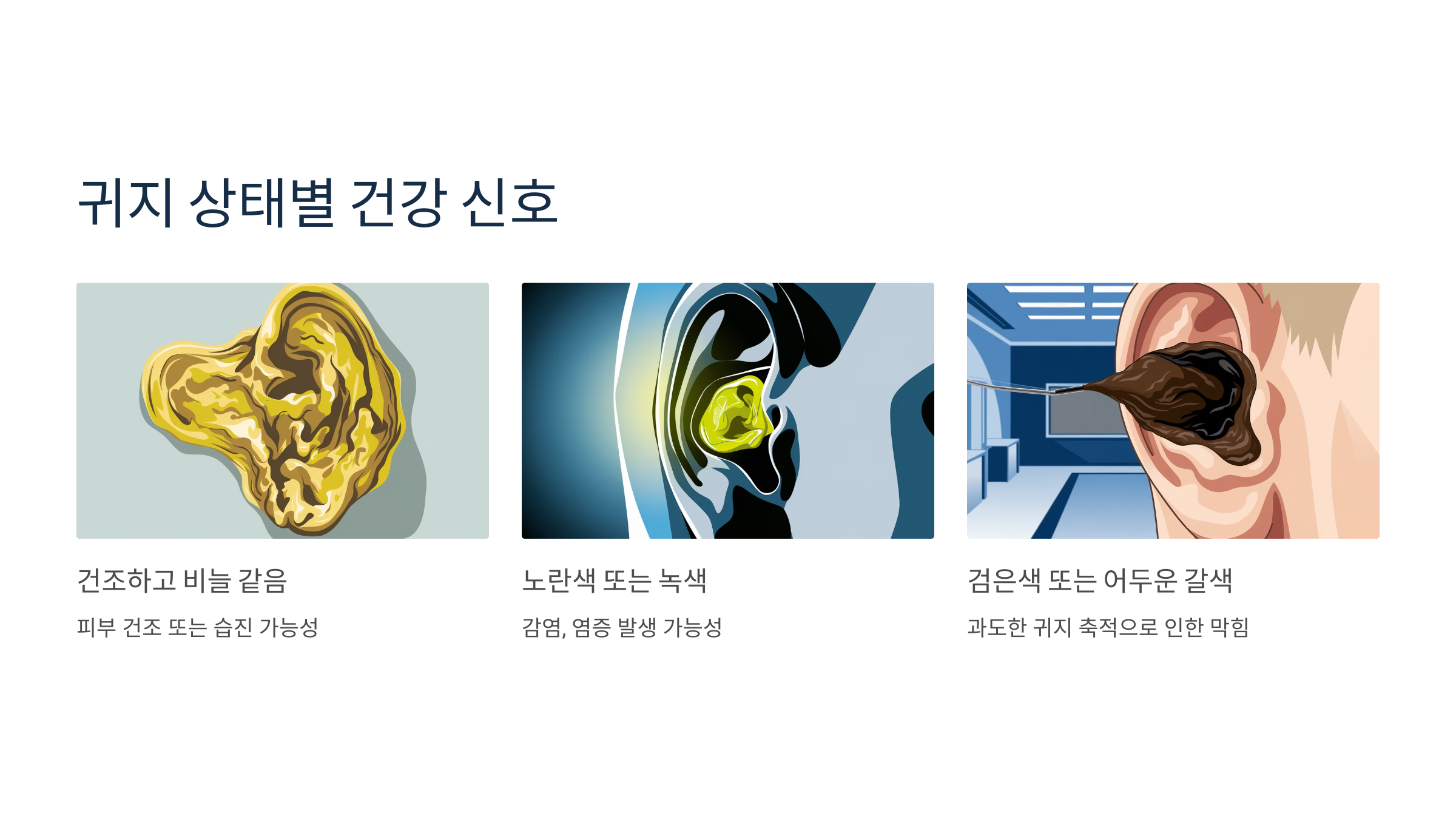 | 검은색 또는 어두운 갈색 | 과도한 귀지 축적으로 인한 막힘 | 귀 세척 또는 이비인후과에서 귀지 제거 | 청력이 떨어지면 전문가 상담 필요 |