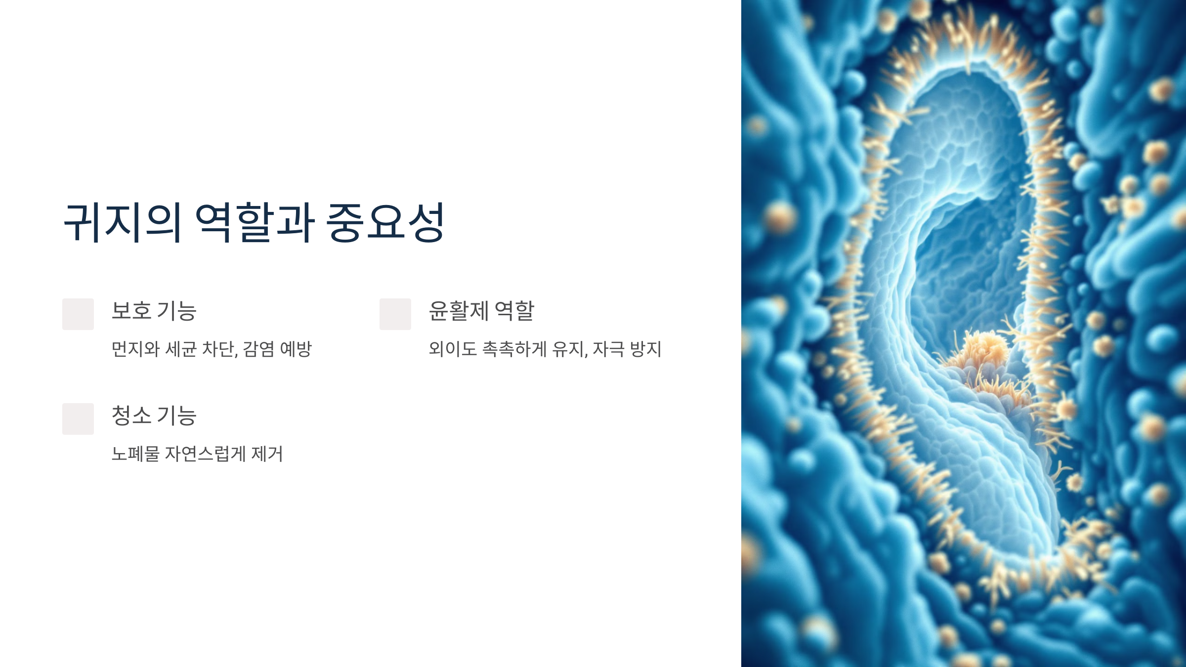 - 청소 기능: 귀지는 이동하며 외이도의 노폐물을 자연스럽게 제거합니다.