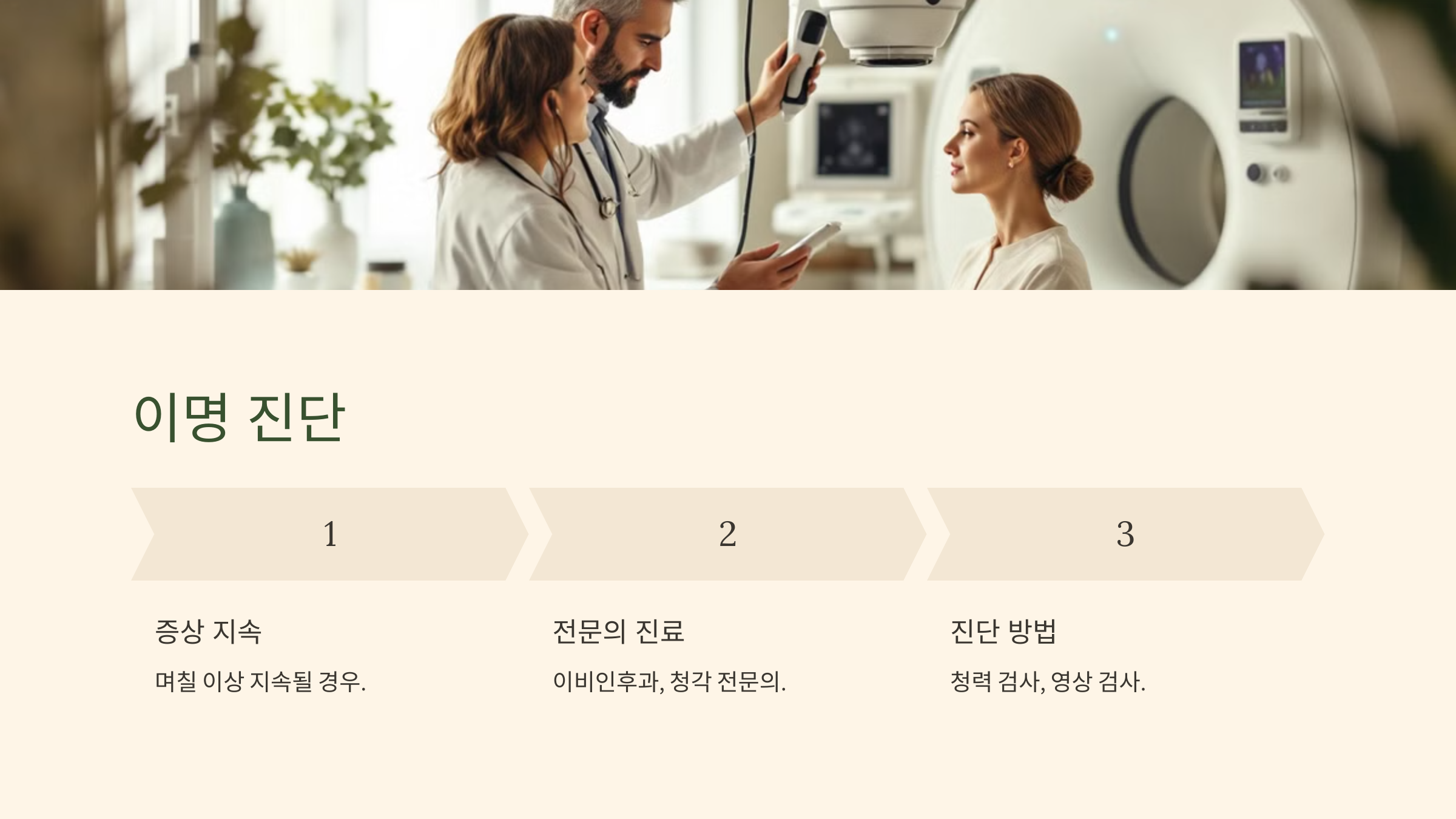 이명이 며칠 이상 지속되거나, 어지러움, 청력 손실, 통증을 동반할 때는 전문가의 상담을 받아야 합니다.