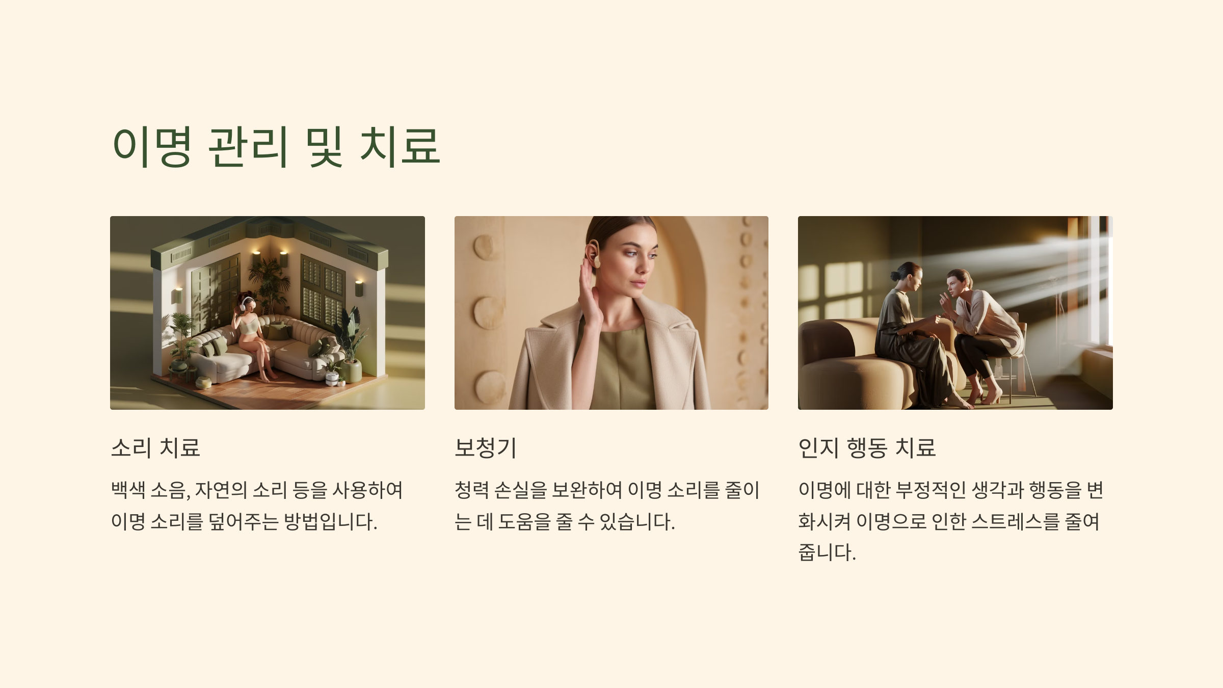 이명에 대한 명확한 치료법은 없지만, 소리 치료, 보청기, 인지 행동 치료(CBT) 등을 통해 증상을 관리할 수 있습니다.