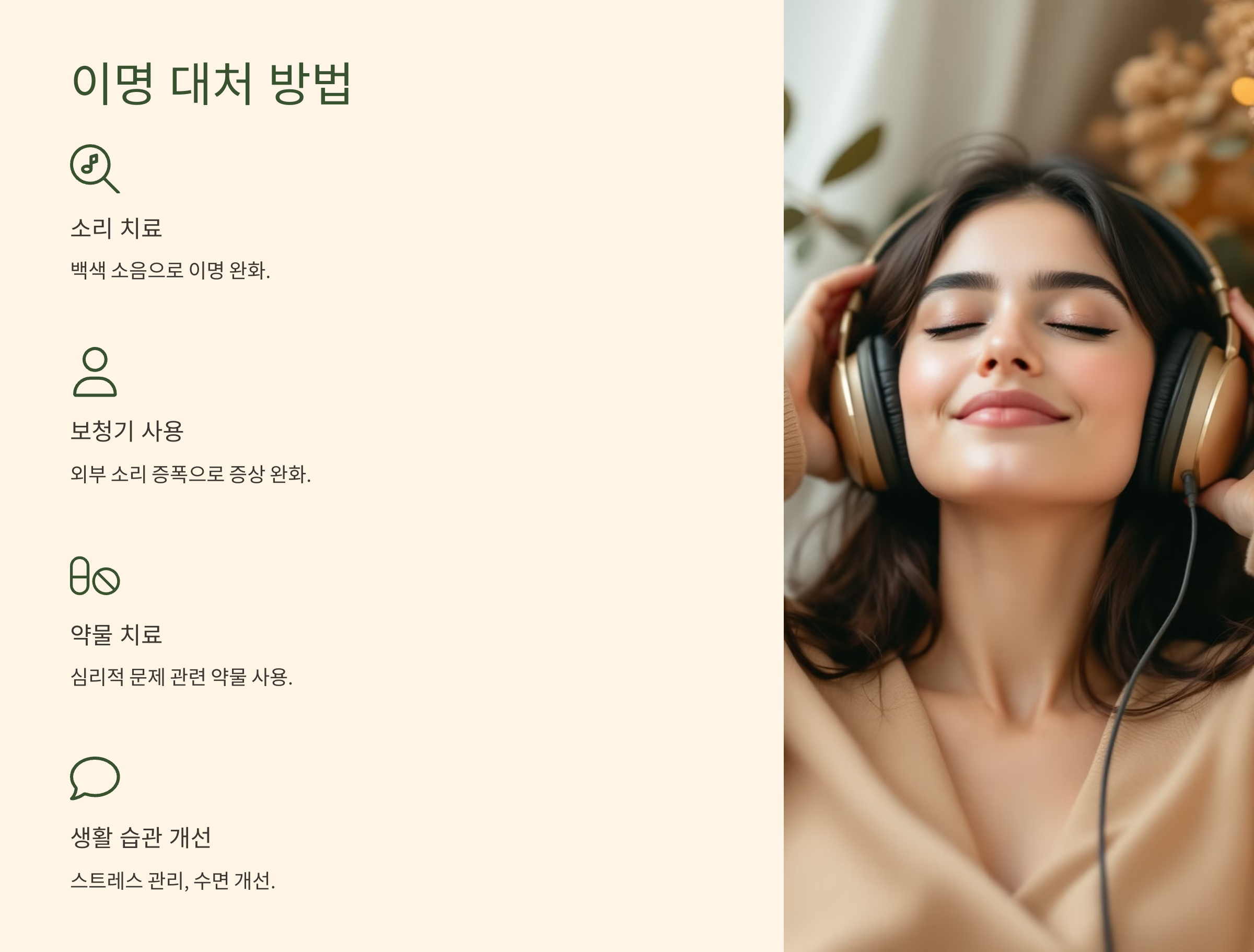 - 소리 치료: 백색 소음 기기나 음악을 이용해 이명 소리를 덜 느끼게 할 수 있습니다.