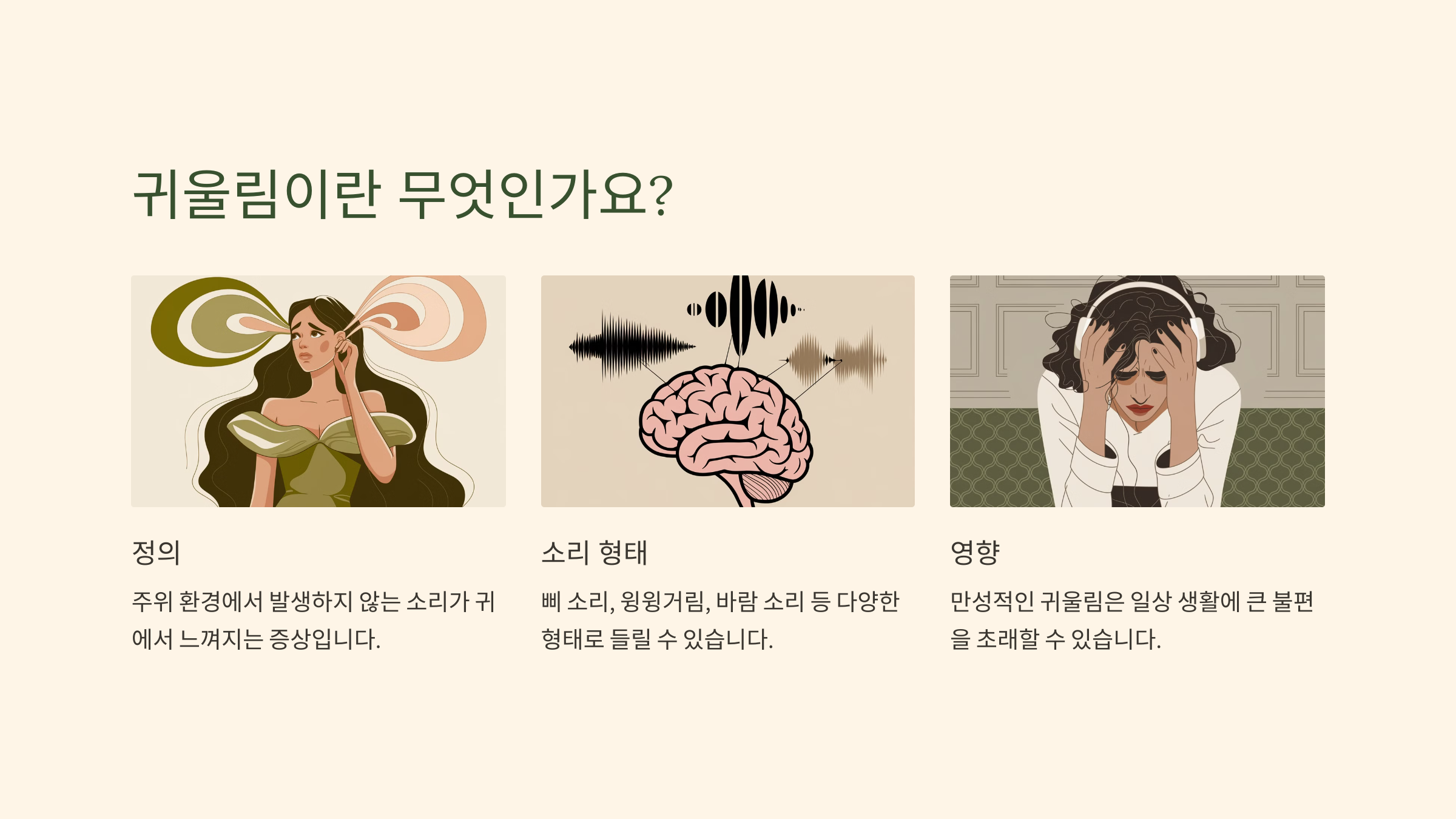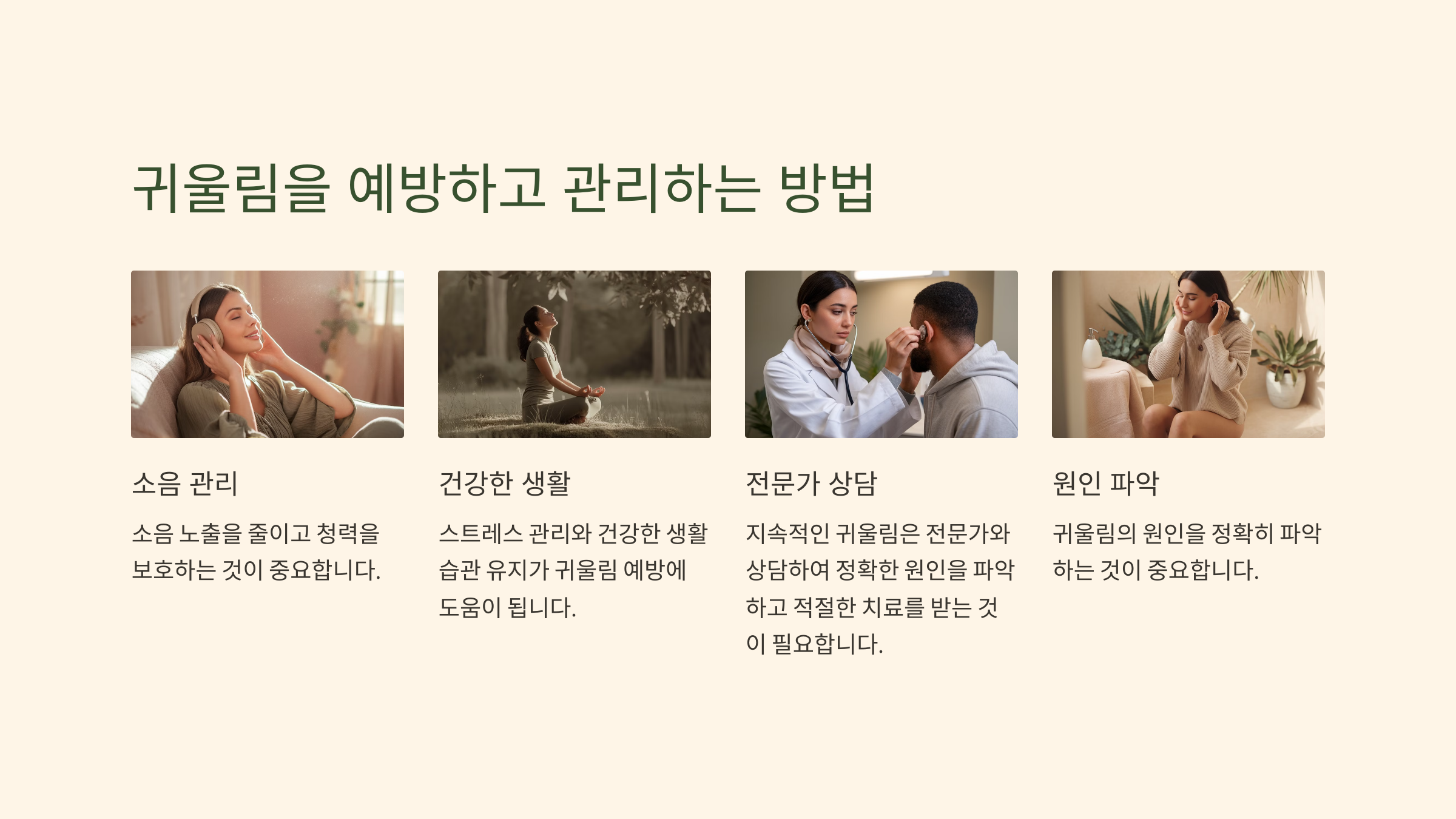 귀울림은 일상생활에 영향을 미칠 수 있는 불편한 증상 중 하나입니다. 하지만 원인을 파악하고 적절한 조치를 취한다면 충분히 관리할 수 있습니다. 소음 노출을 줄이고, 정기적인 건강 검사를 통해 청력을 보호하는 것이 중요합니다. 특히, 스트레스 관리와 건강한 생활 습관을 유지함으로써 귀울림 증상을 완화할 수 있습니다.