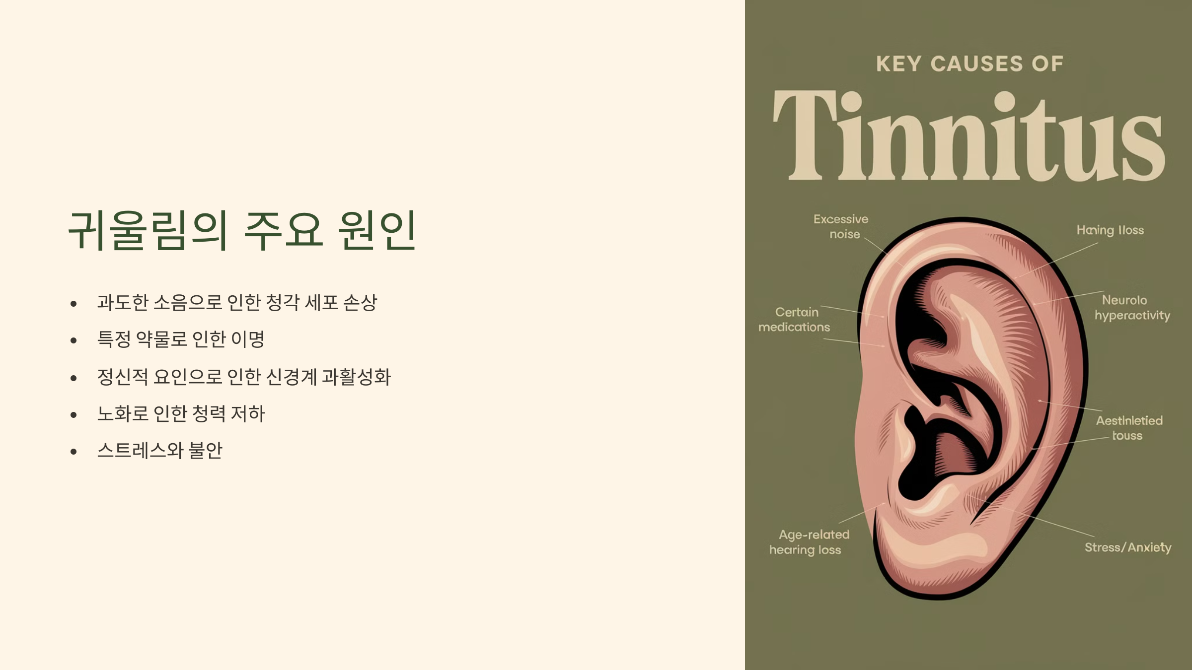 귀울림의 원인은 여러 가지가 있으며, 그중에는 우리가 쉽게 예측할 수 없는 원인도 많습니다. 아래에서 귀울림의 주요 원인을 알아보겠습니다.