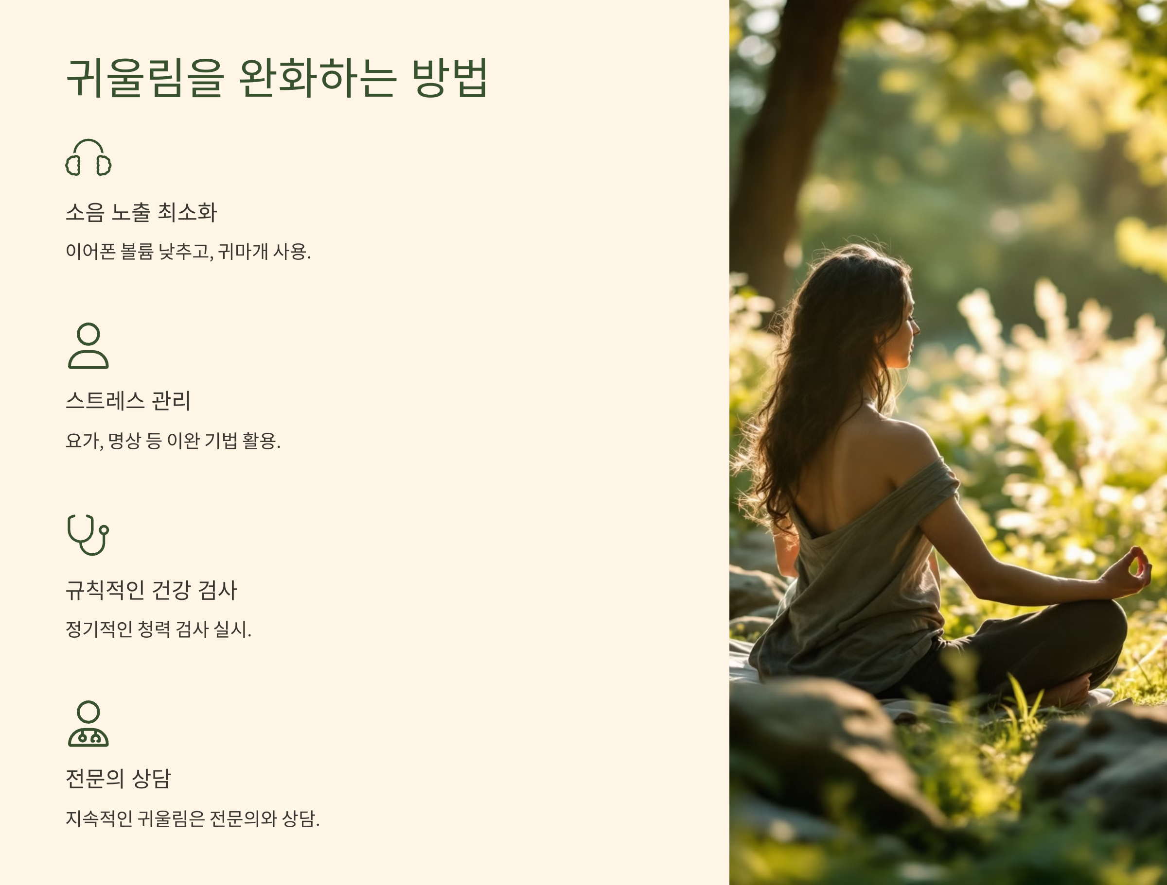 - 스트레스 관리: 요가, 명상 등 이완 기법을 활용하여 스트레스를 줄이는 것이 귀울림 완화에 도움을 줄 수 있습니다.