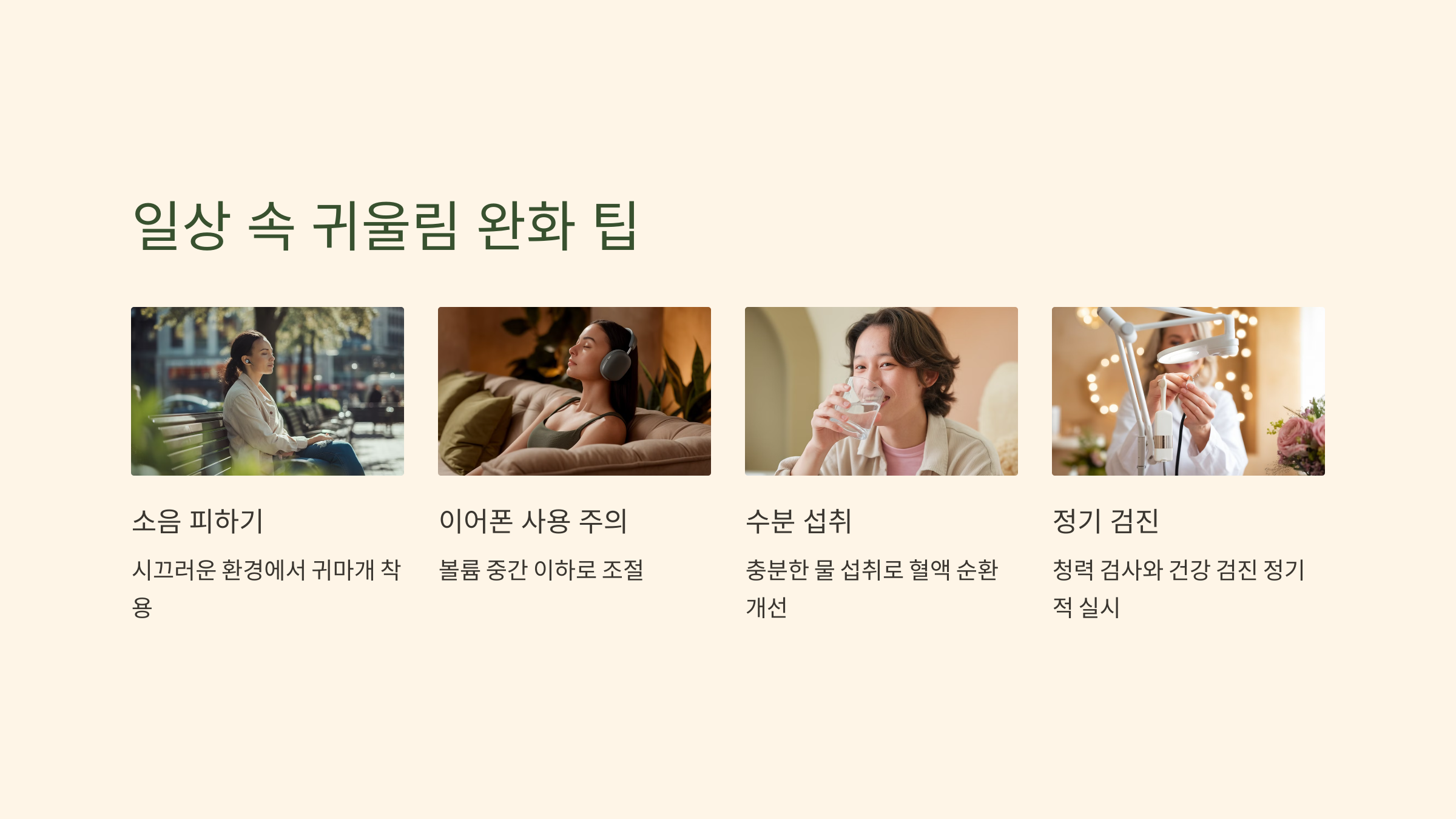 귀울림 완화는 작은 변화에서 시작됩니다. 다음은 일상에서 실천할 수 있는 몇 가지 간단한 팁입니다.