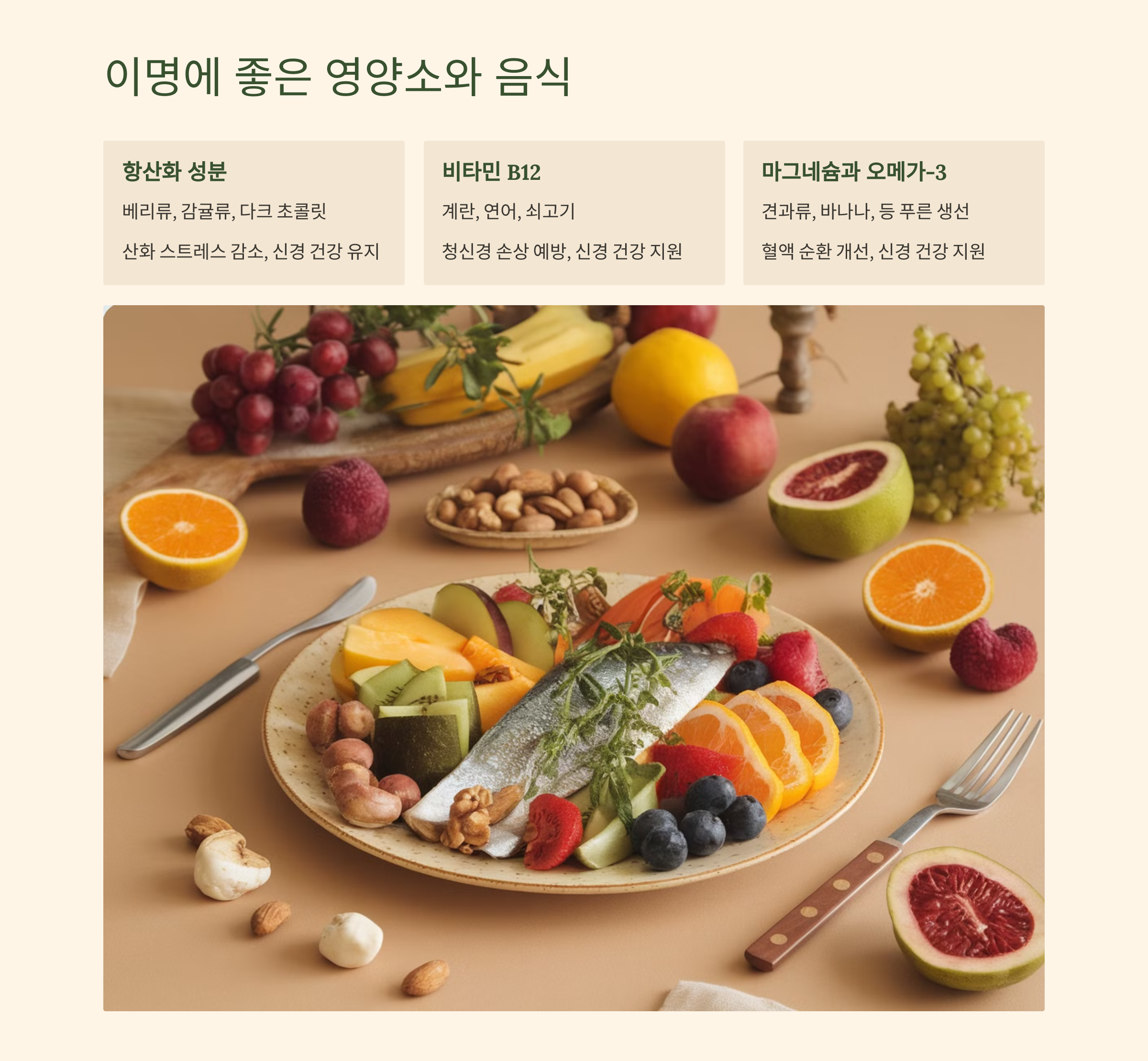 - 연어, 고등어, 정어리: 등 푸른 생선들은 오메가-3 지방산이 풍부하여 신경 건강에 도움이 됩니다.
