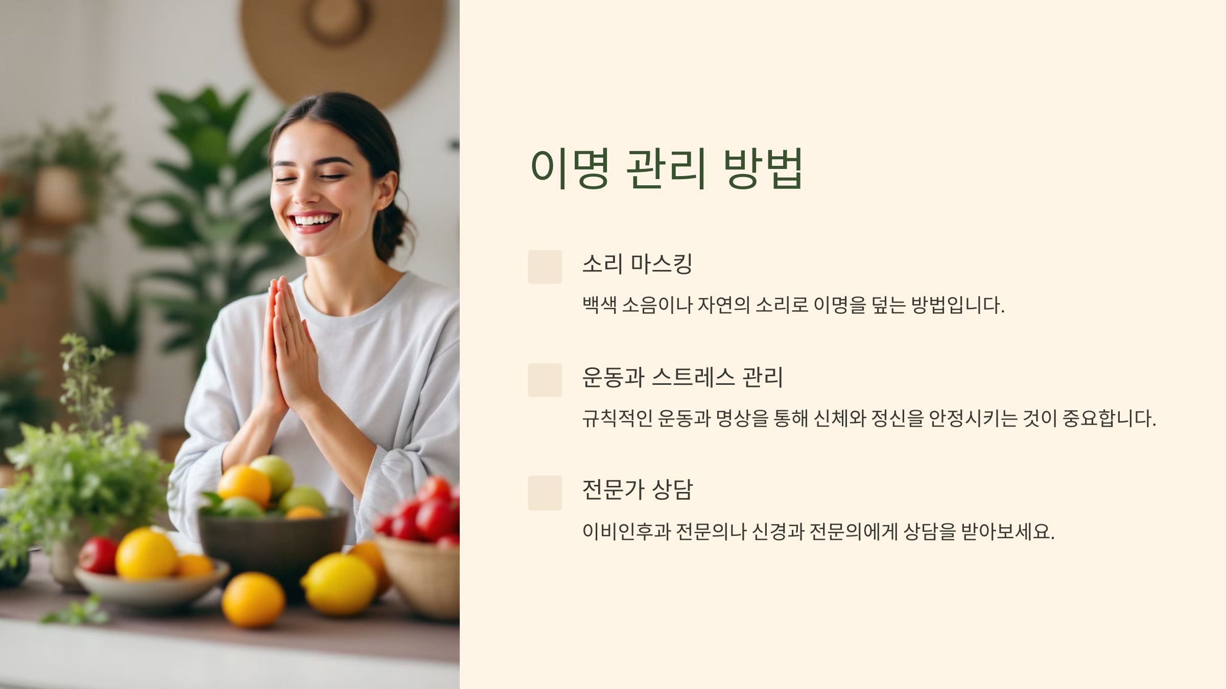 이명은 오해를 바로잡고 체계적인 관리를 통해 삶의 질을 높일 수 있습니다. 아래의 방법들은 이명 증상을 줄이거나, 이를 일상적으로 관리하는 데 도움이 됩니다.