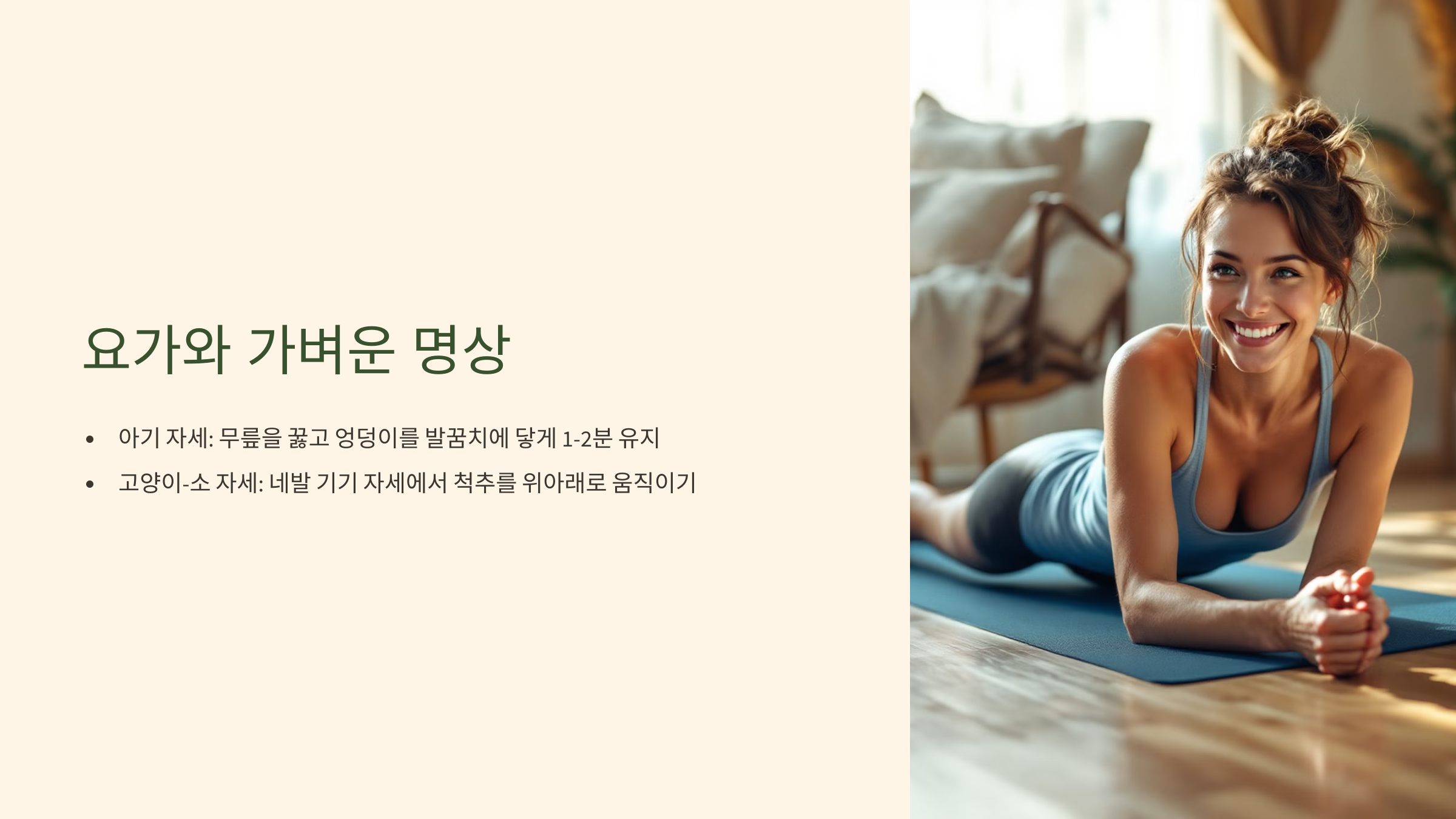 - 아기 자세 (Child’s Pose): 무릎을 꿇고 엉덩이를 발꿈치에 닿도록 하여 앞으로 몸을 숙입니다. 팔을 앞으로 뻗어 이완을 느끼며 1-2분간 유지합니다.