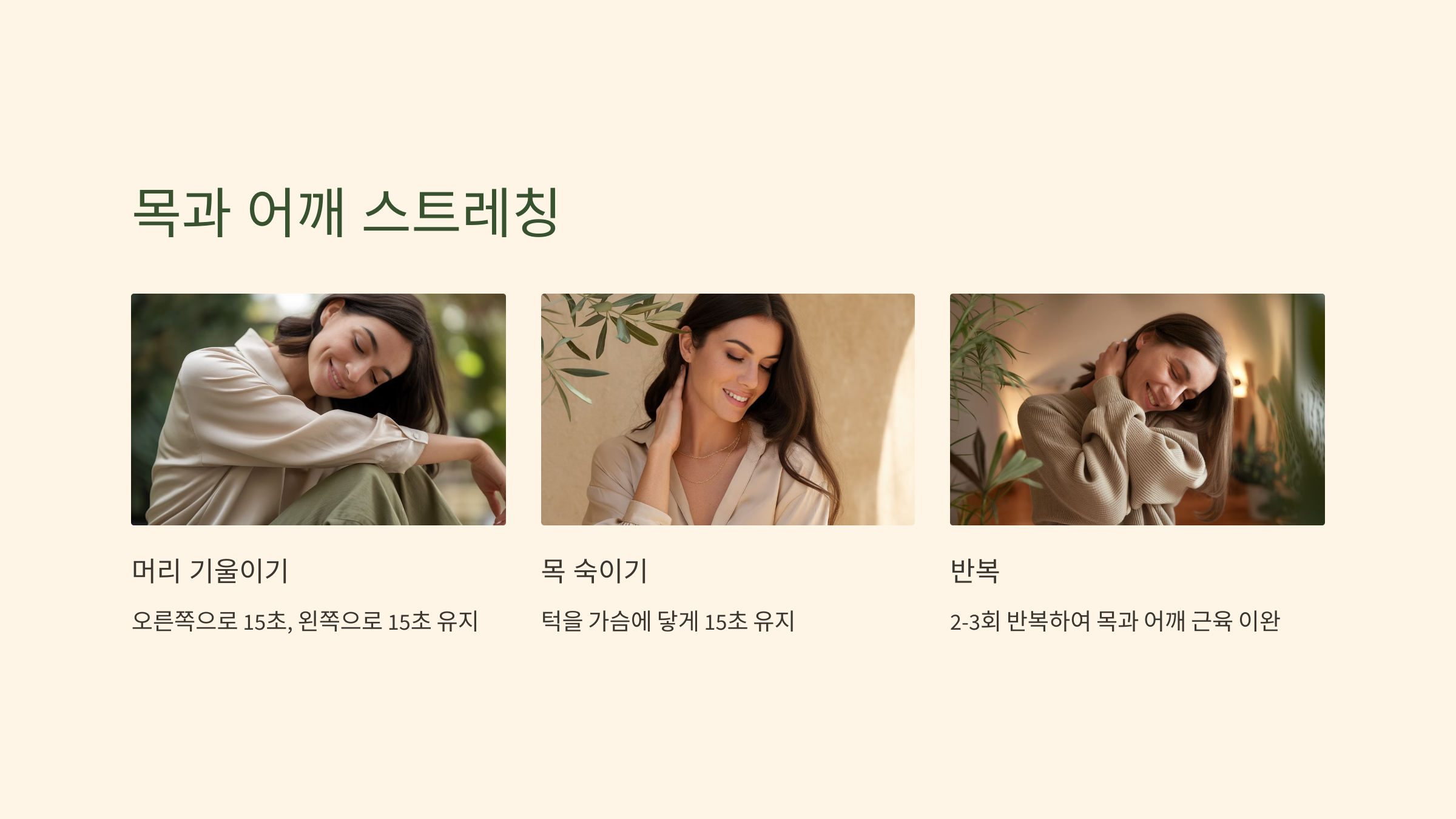 - 이 과정을 2-3회 반복하며, 목과 어깨 근육이 긴장을 풀어지도록 합니다.