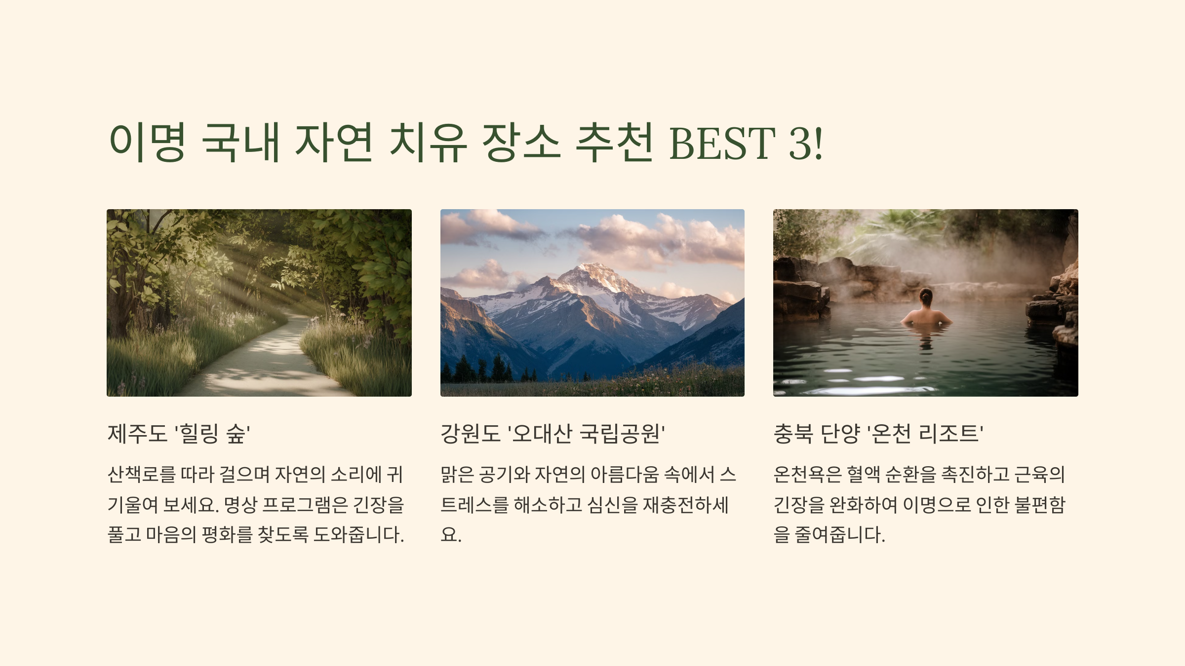 - 제주도 '힐링 숲': 제주도의 힐링 숲은 다양한 산책 코스와 명상 프로그램을 운영하여 자연 속에서 마음을 비우고, 이명 증상을 완화할 수 있는 최적의 장소입니다. 특히, 산림치유 전문가의 안내 아래 자연의 소리를 들으며 이명 완화에 도움을 줄 수 있는 프로그램을 체험할 수 있습니다.