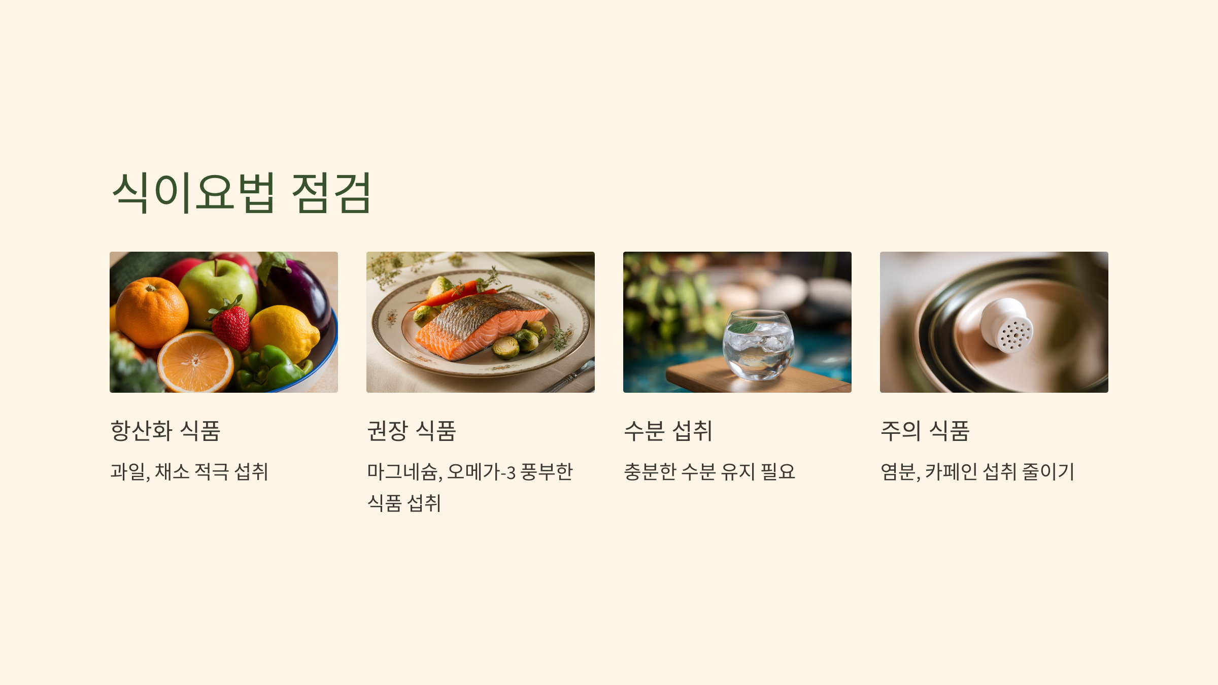 이 점검표에서 2개 이상 해당된다면, 식이요법을 개선하는 것이 중요합니다. 마그네슘과 오메가-3가 풍부한 식품(견과류, 연어 등)을 섭취하고, 충분한 수분을 유지하세요. 또한, 과일과 채소를 적극적으로 섭취하여 항산화 작용을 높이는 것이 이명 예방에 도움이 됩니다.
