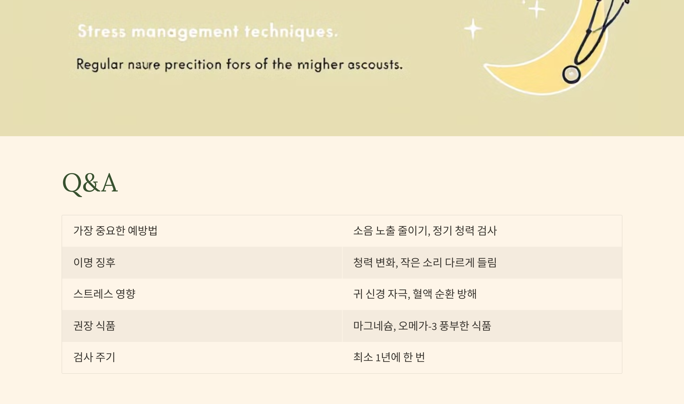 A1. 소음 노출을 줄이고, 정기적인 청력 검사를 통해 귀 건강 상태를 점검하는 것이 중요합니다.