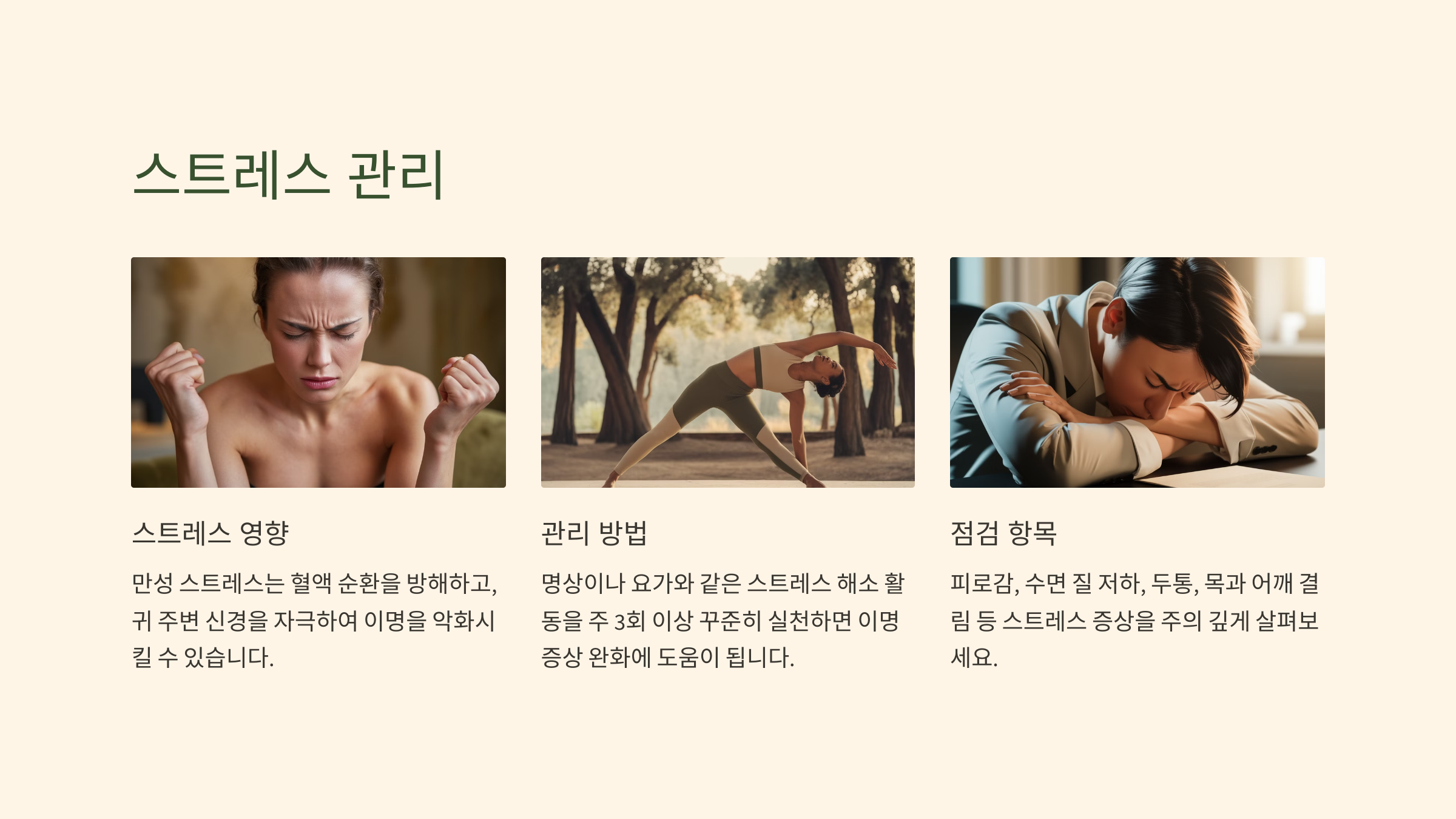 A3. 스트레스는 귀 주변 신경을 자극하고 혈액 순환을 방해하여 이명 증상을 유발할 수 있습니다. 규칙적인 명상과 요가로 스트레스를 관리하세요.