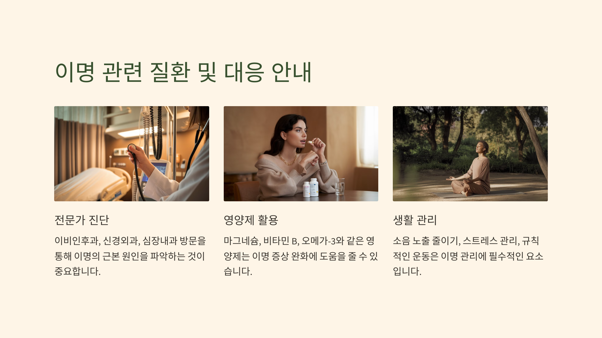 이명은 단순히 귀에서 소리가 들리는 증상뿐만 아니라 다양한 질환과 연관될 수 있는 건강 문제입니다. 이명의 원인은 매우 다양하며, 이로 인해 발생할 수 있는 관련 질환을 이해하고 올바르게 관리하는 것이 중요합니다. 이번 포스팅에서는 이명과 연관된 질환을 전문적인 관점에서 쉽게 설명하고, 질환 발생 시 자신의 컨디션을 이해할 수 있는 정보와 적합한 진료과를 안내하겠습니다. 또한, 이명과 관련된 질환에 도움이 되는 영양제와 약물을 추천하여 실생활에서 쉽게 구할 수 있는 정보를 제공합니다.