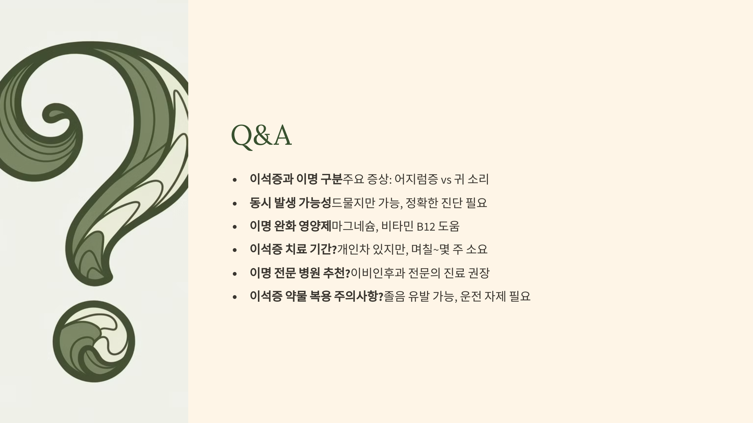 A4. 마그네슘과 비타민 B12가 이명 완화에 도움이 됩니다. 신경 안정과 혈액 순환을 촉진합니다.