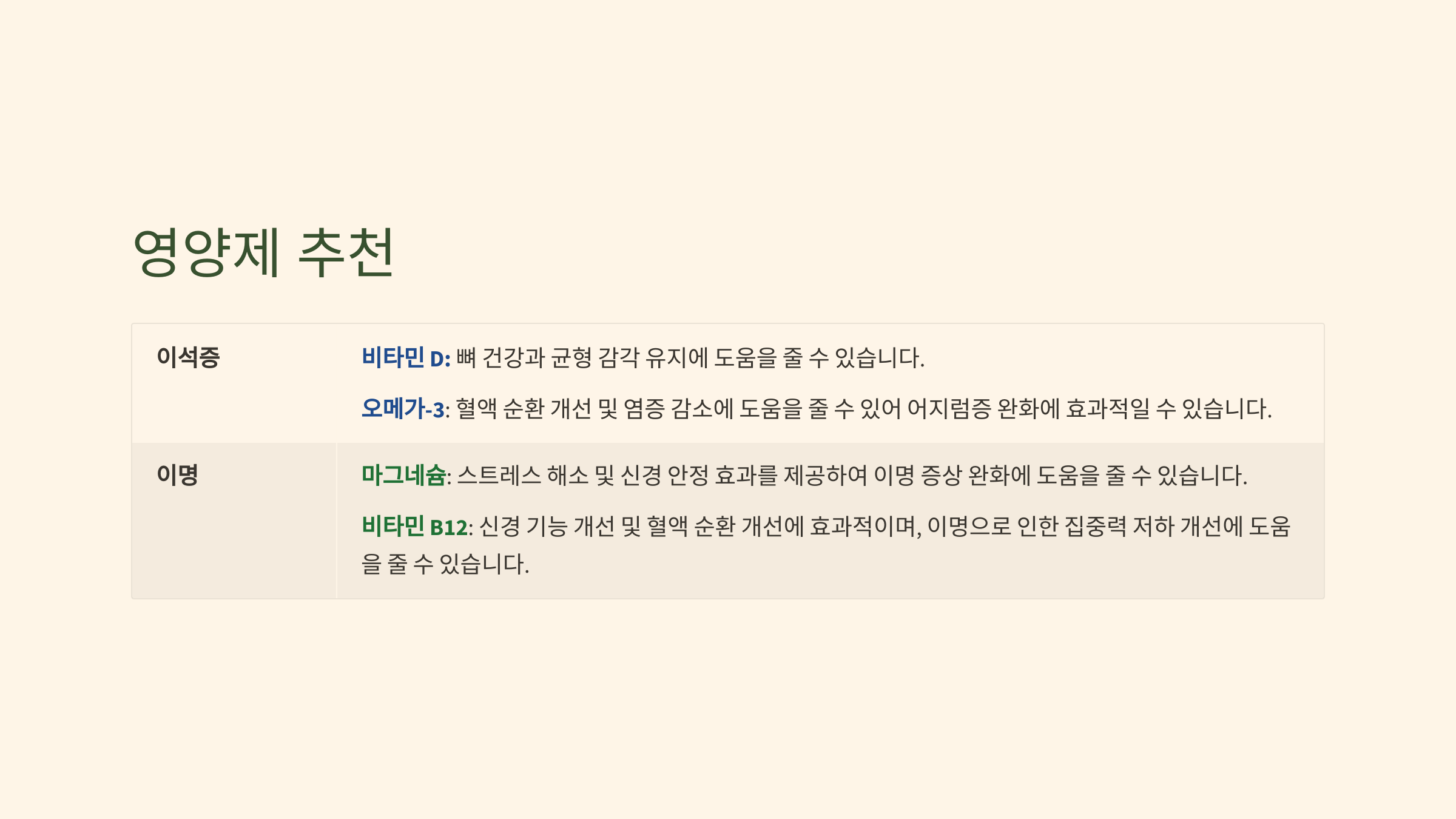 - 비타민 B 복합체와 마그네슘 영양제를 함께 복용하면 신경 안정에 도움이 됩니다.