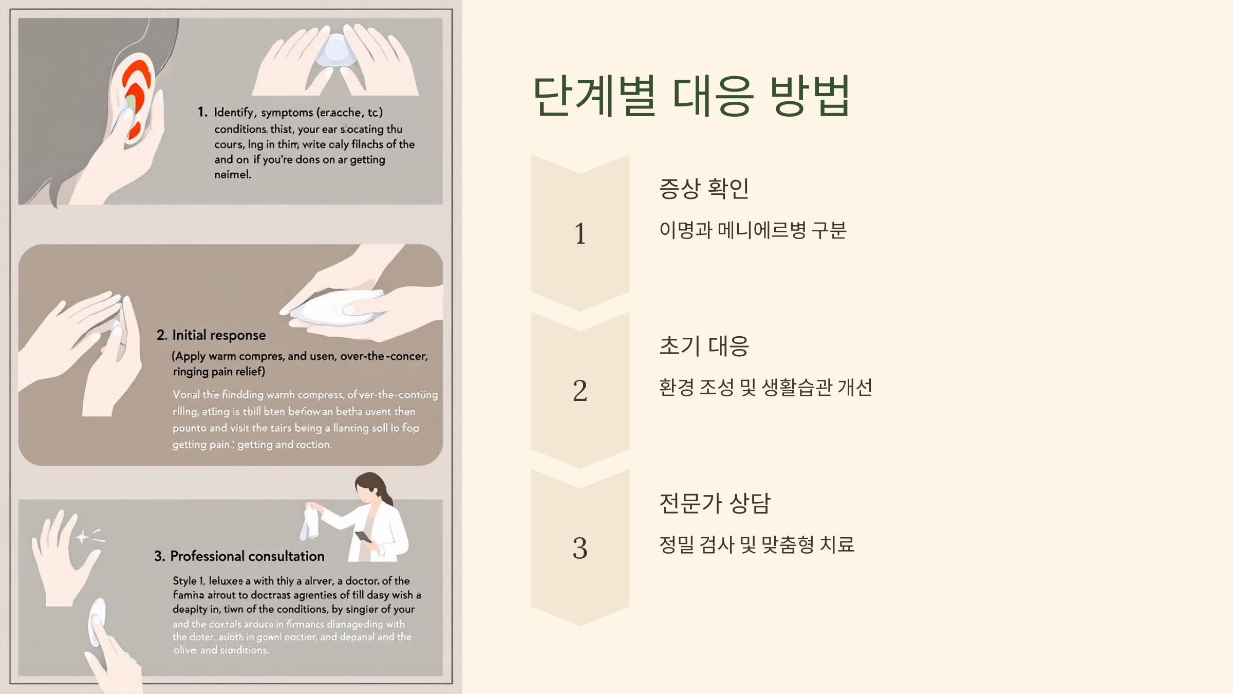 이명과 메니에르병은 비슷한 증상으로 혼동될 수 있지만, 각각의 원인과 치료법이 다르므로 정확히 구분하고 관리하는 것이 중요합니다. 이 포스팅에서 제공한 점검표와 단계별 대응 방법을 통해 자신의 상태를 명확히 이해하고, 적절한 치료법을 찾아 증상을 효과적으로 관리하시길 바랍니다. 증상이 지속되거나 악화될 경우 전문가의 상담을 받는 것이 최선입니다.