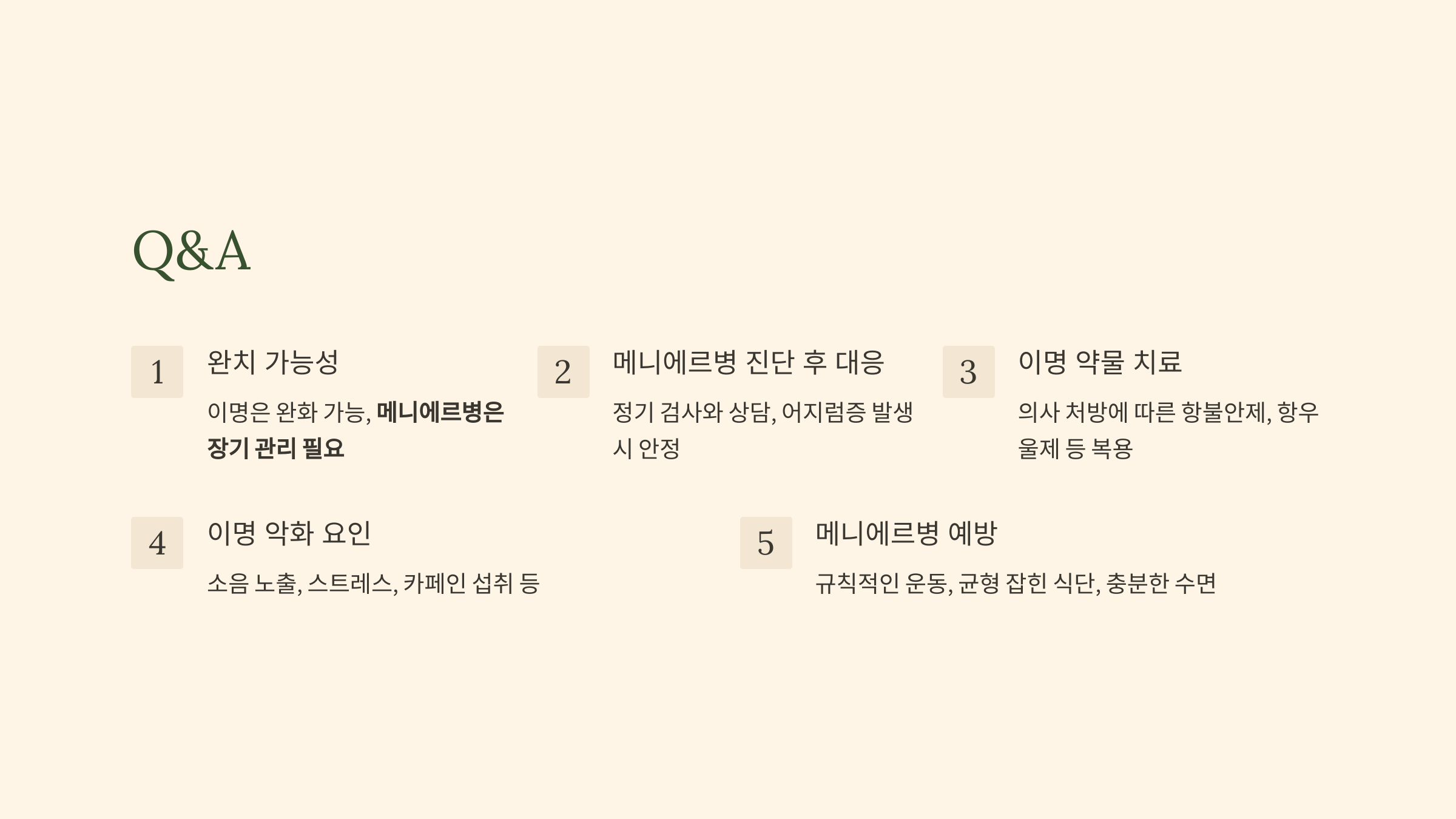 A1. 이명은 원인에 따라 완화될 수 있으며, 메니에르병은 장기적인 관리와 치료가 필요합니다.