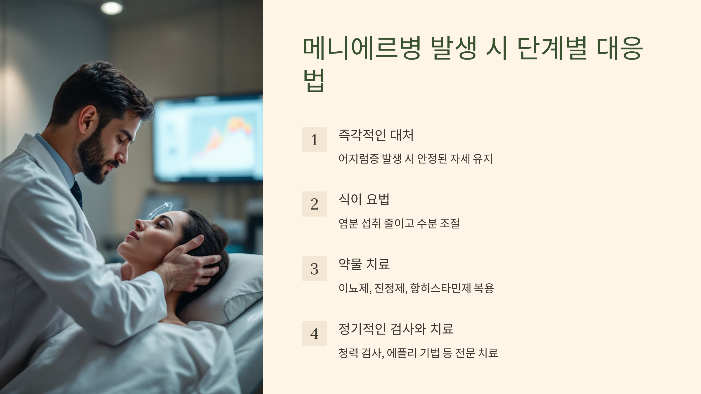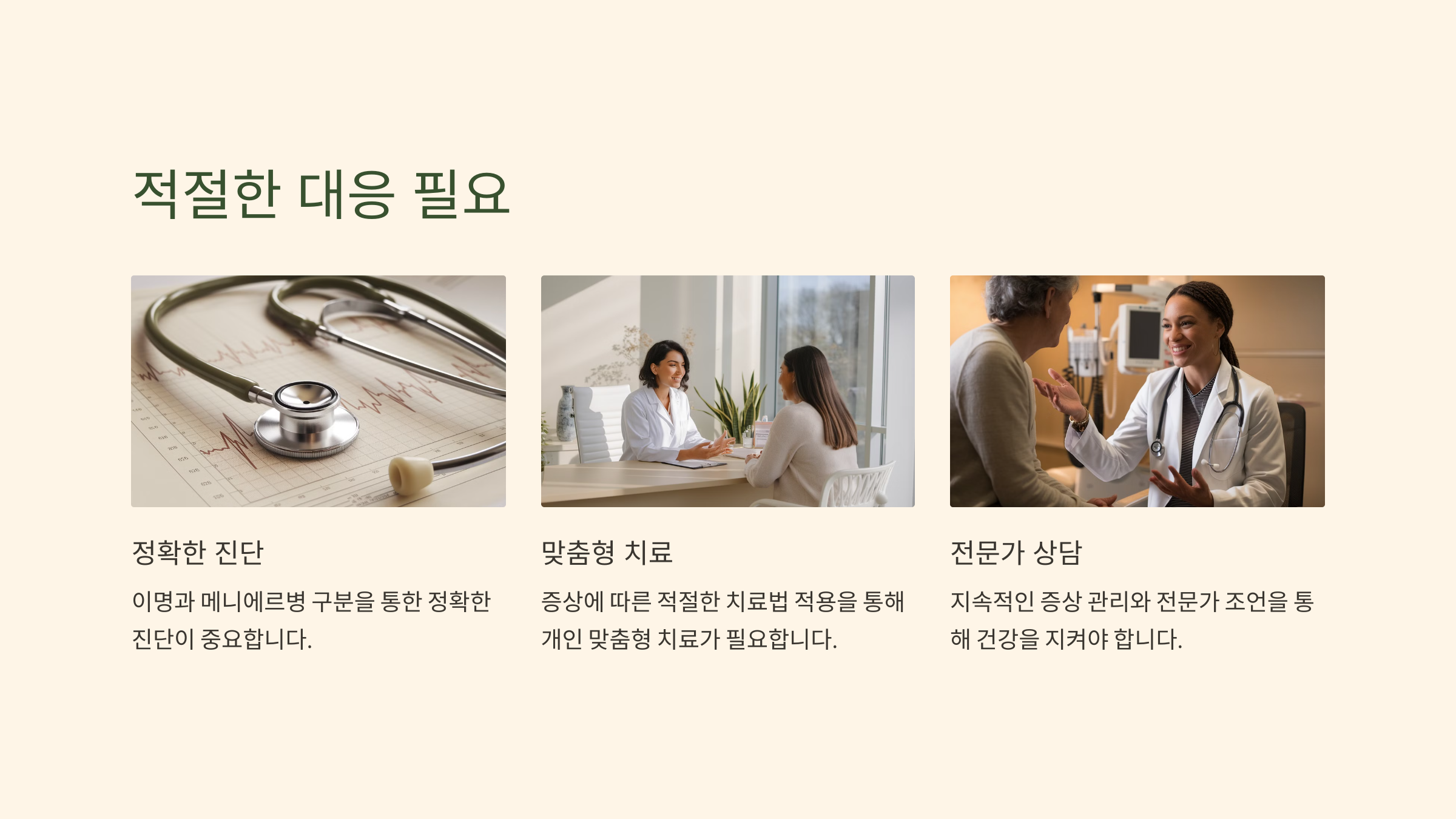 위 점검표에서 메니에르병 증상이 확인될 경우, 즉시 전문가의 상담을 받아야 합니다.