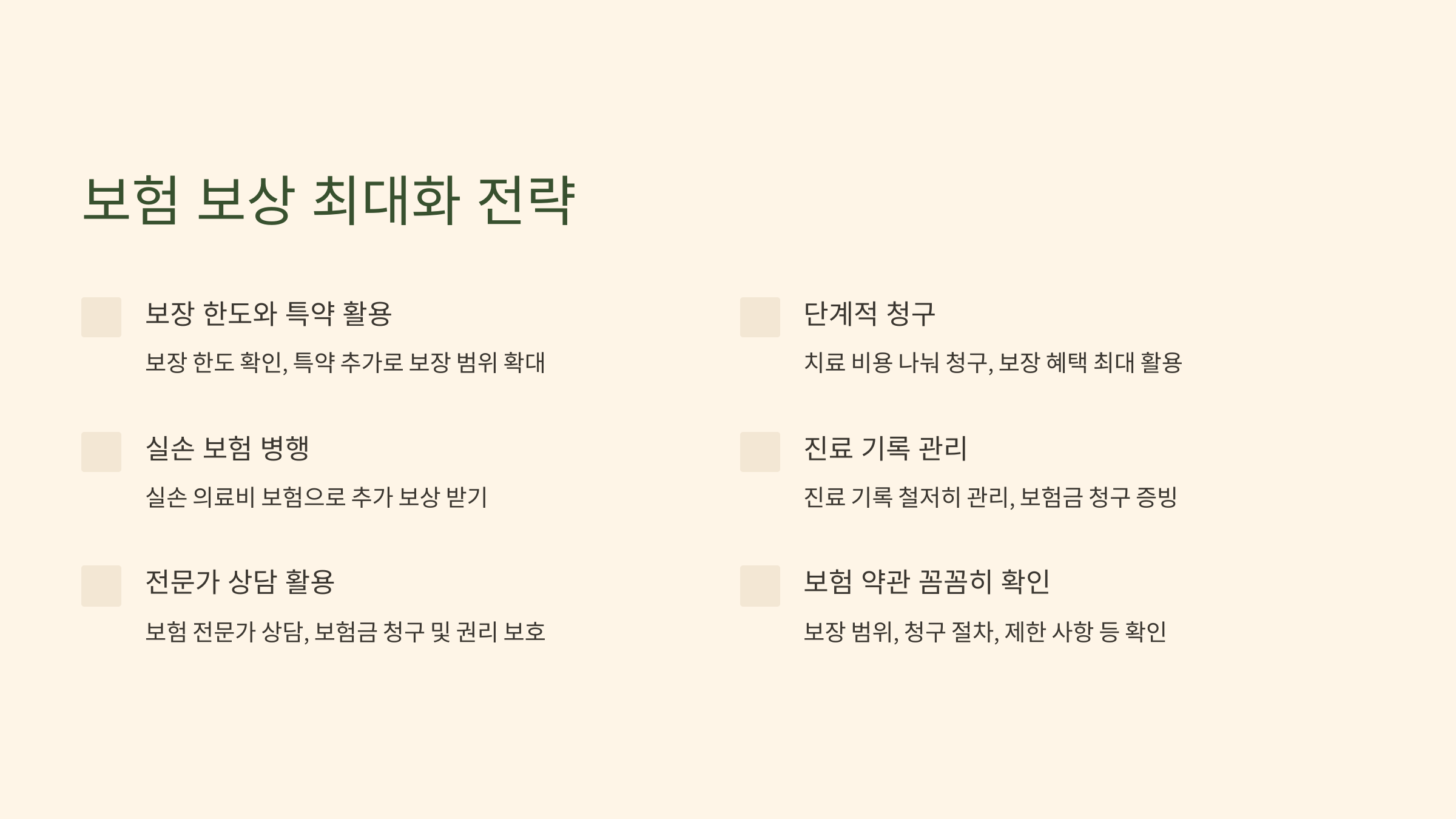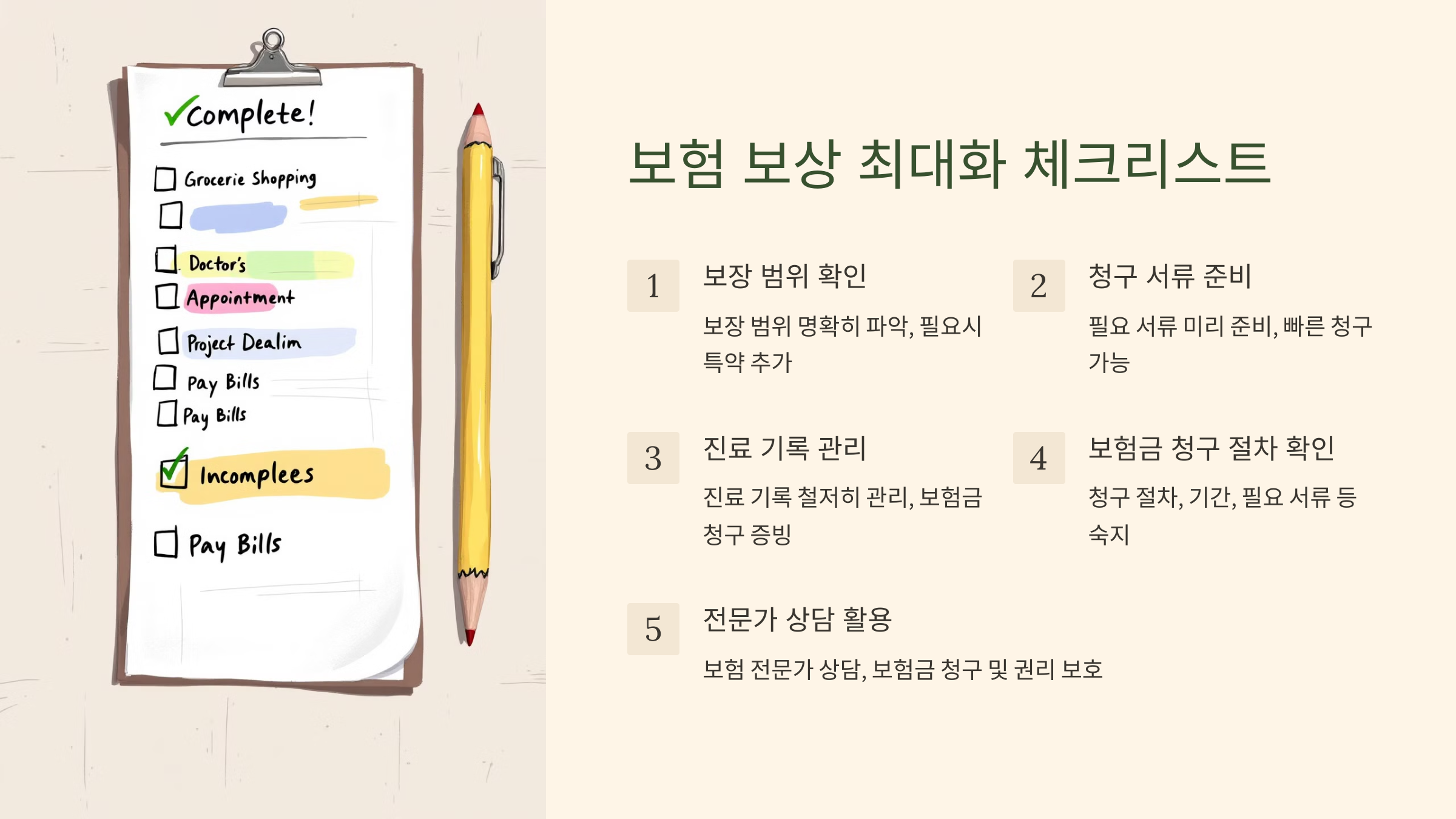 이 체크리스트를 통해 보험 보상을 최대화하는 과정을 더 쉽게 관리할 수 있습니다. 단계별로 확인하고 체크하여 치료비 보상 절차를 원활하게 진행하세요.