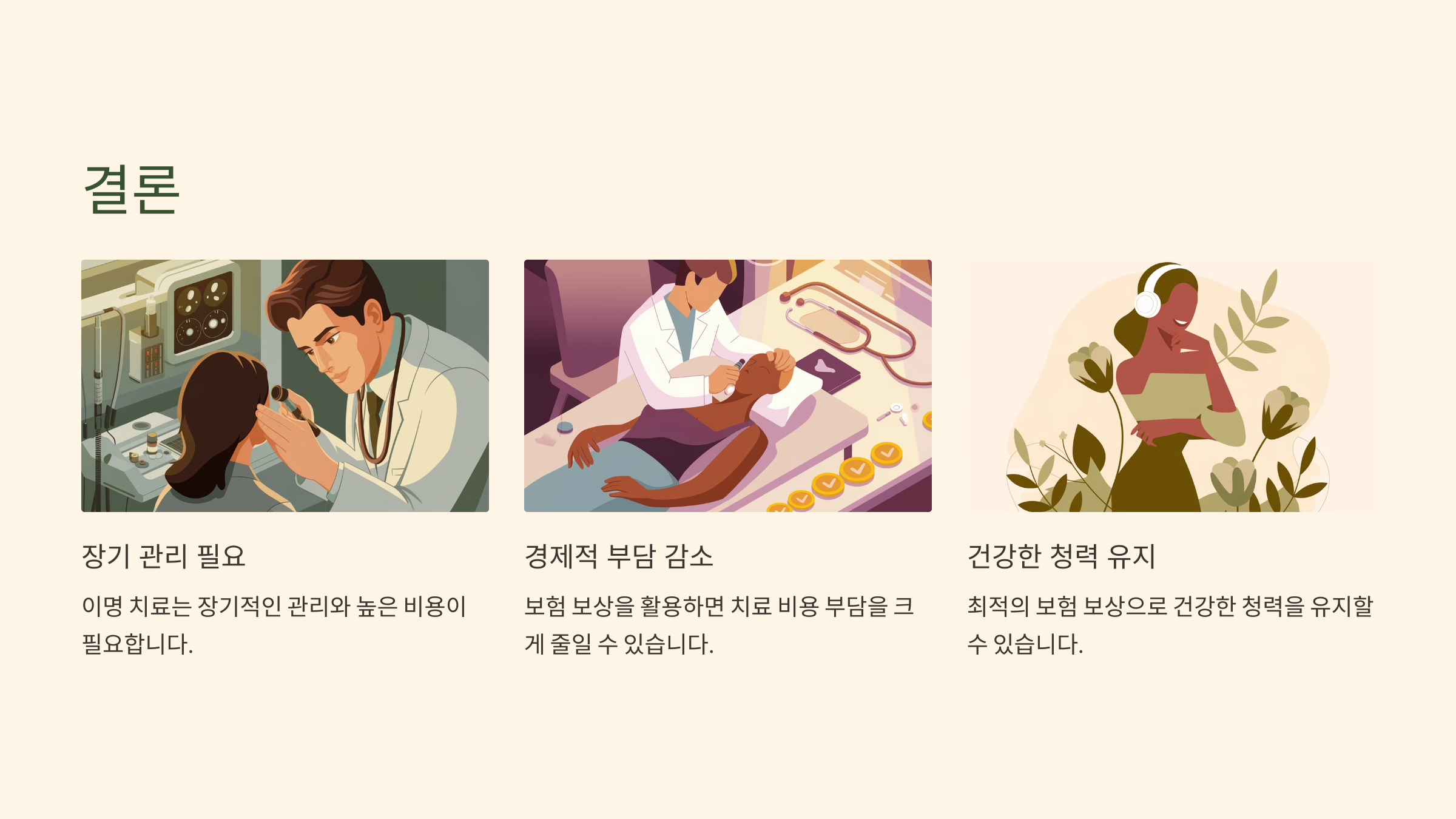 이명은 장기적으로 관리해야 하는 경우가 많아, 장기 치료에 대비한 보장 범위가 중요한 요소입니다. 청력 손실이나 이명 치료는 한두 번의 치료로 끝나지 않을 수 있으므로, 장기적으로 치료비를 지원받을 수 있는 보험을 선택하세요.