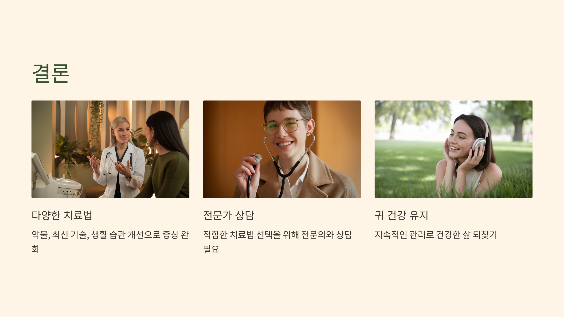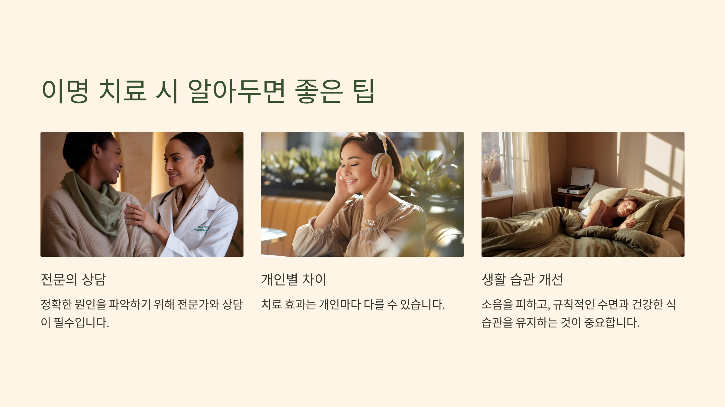 이명은 복합적인 원인에 의해 발생할 수 있기 때문에, 단순히 자가 치료나 보조제를 사용하는 것보다 전문적인 상담을 통해 정확한 원인을 파악하는 것이 중요합니다. 청력 전문가나 이비인후과 전문의와의 상담을 통해 본인의 상태에 맞는 치료법을 선택하는 것이 좋습니다.