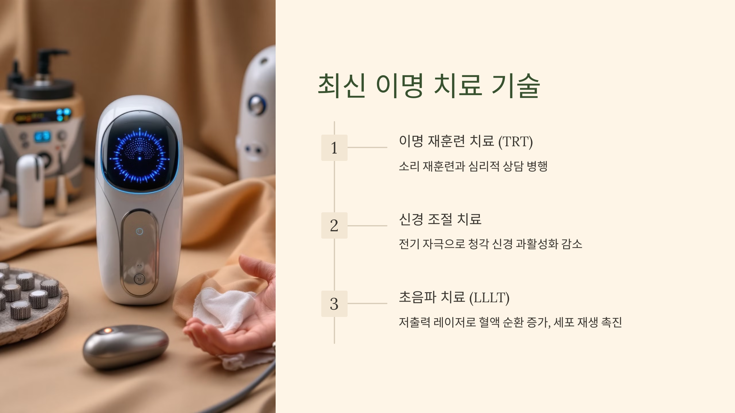 최근에는 약물 치료 외에도 첨단 기술을 활용한 이명 치료법이 활발하게 연구 및 개발되고 있습니다. 다음은 가장 최신의 이명 치료 기술들입니다.