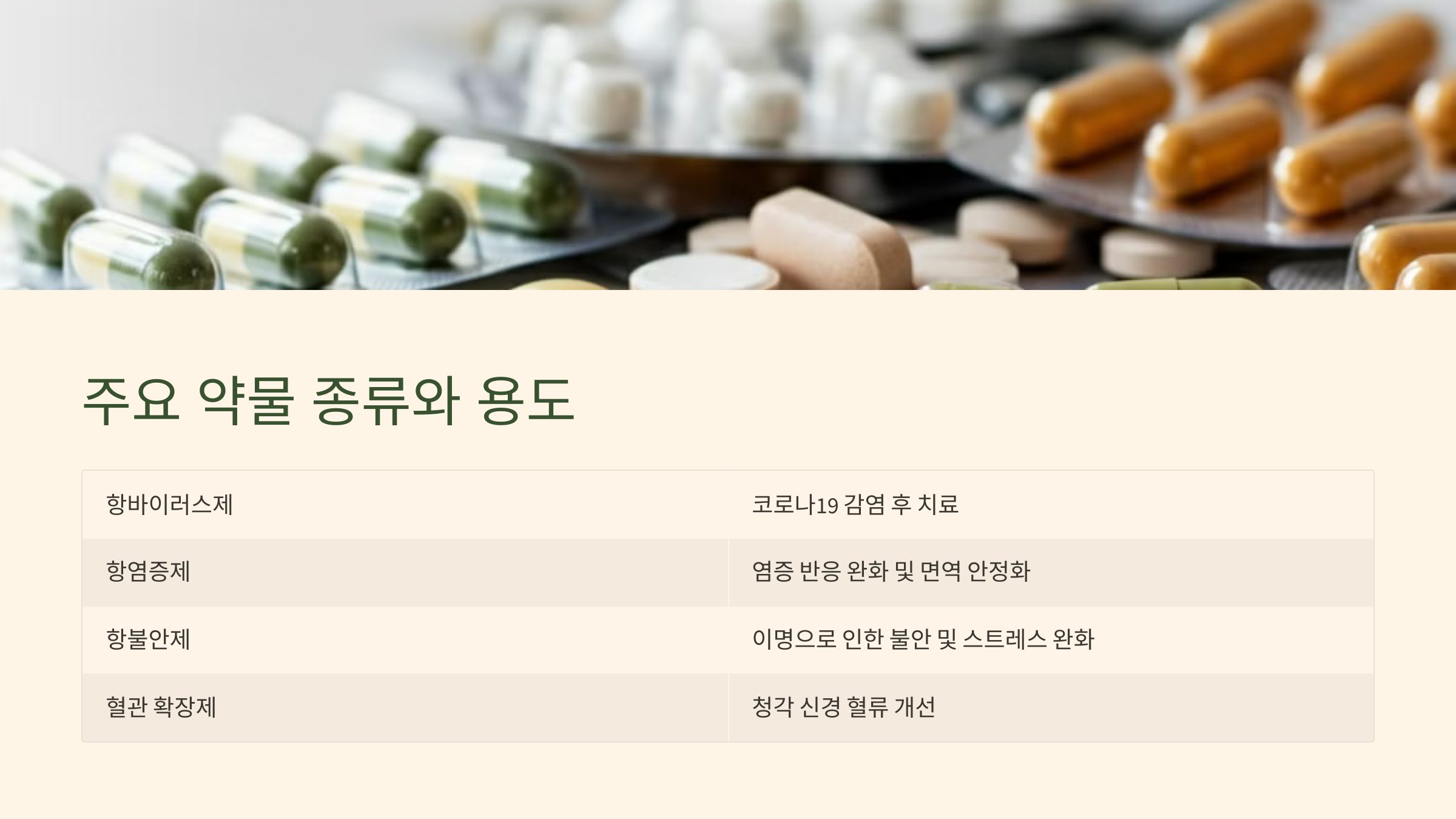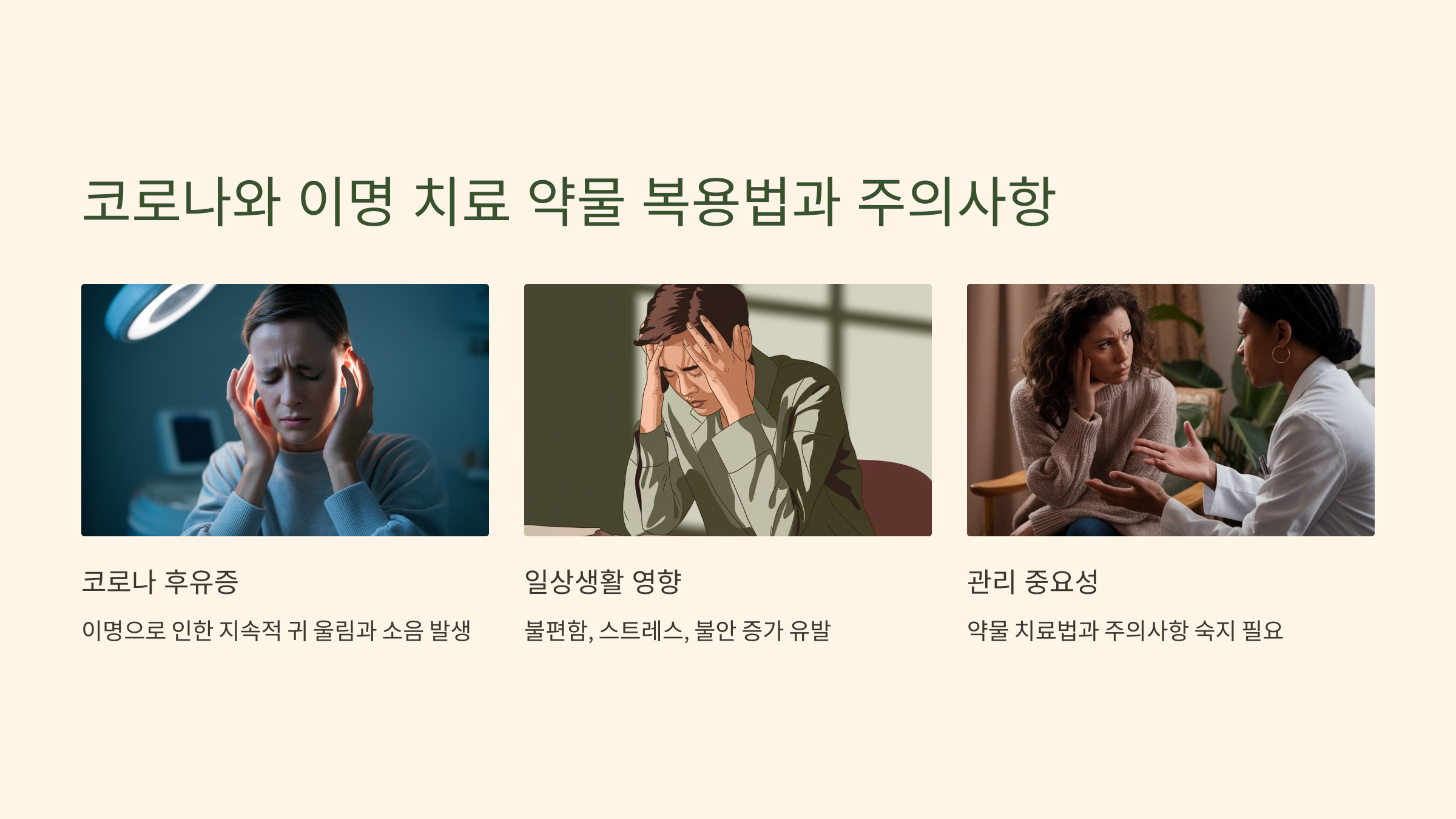 코로나19 후유증으로 발생한 이명은 적절한 약물 치료와 생활 습관 개선을 통해 완화할 수 있습니다. 항바이러스제, 항염증제와 같은 코로나 치료 약물과 항불안제, 혈관 확장제와 같은 이명 치료 약물을 동시에 복용할 경우, 의사와의 상담을 통해 복용법을 정확히 준수하는 것이 중요합니다. 특히 약물 간 상호작용과 부작용을 피하기 위해 복용 시간 간격을 유지하고, 신체 반응을 주의 깊게 살피며 복용하는 것이 좋습니다. 생활 습관 개선을 병행하여 증상을 효과적으로 관리하고 건강한 일상을 유지하세요.