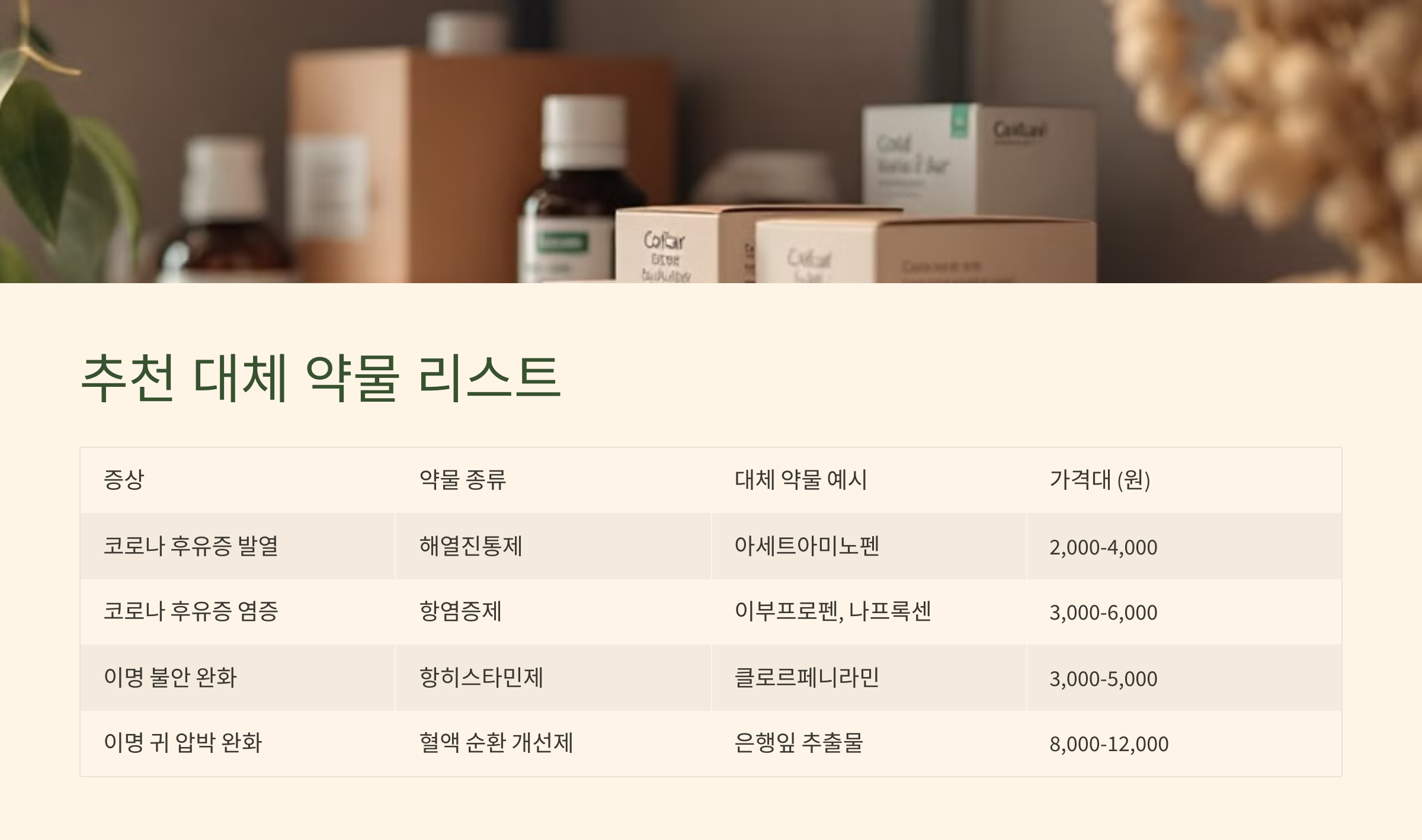 아래 표는 코로나 및 이명 증상을 완화하기 위해 약국에서 구입 가능한 대체 약물들을 정리한 것으로, 증상별로 복용 방법, 주의사항, 대략적인 가격 정보를 포함하고 있습니다. 이 약물들은 장기적인 치료를 대체할 수는 없으며, 응급 상황에서 일시적으로 증상을 완화하는 데 도움을 줍니다.