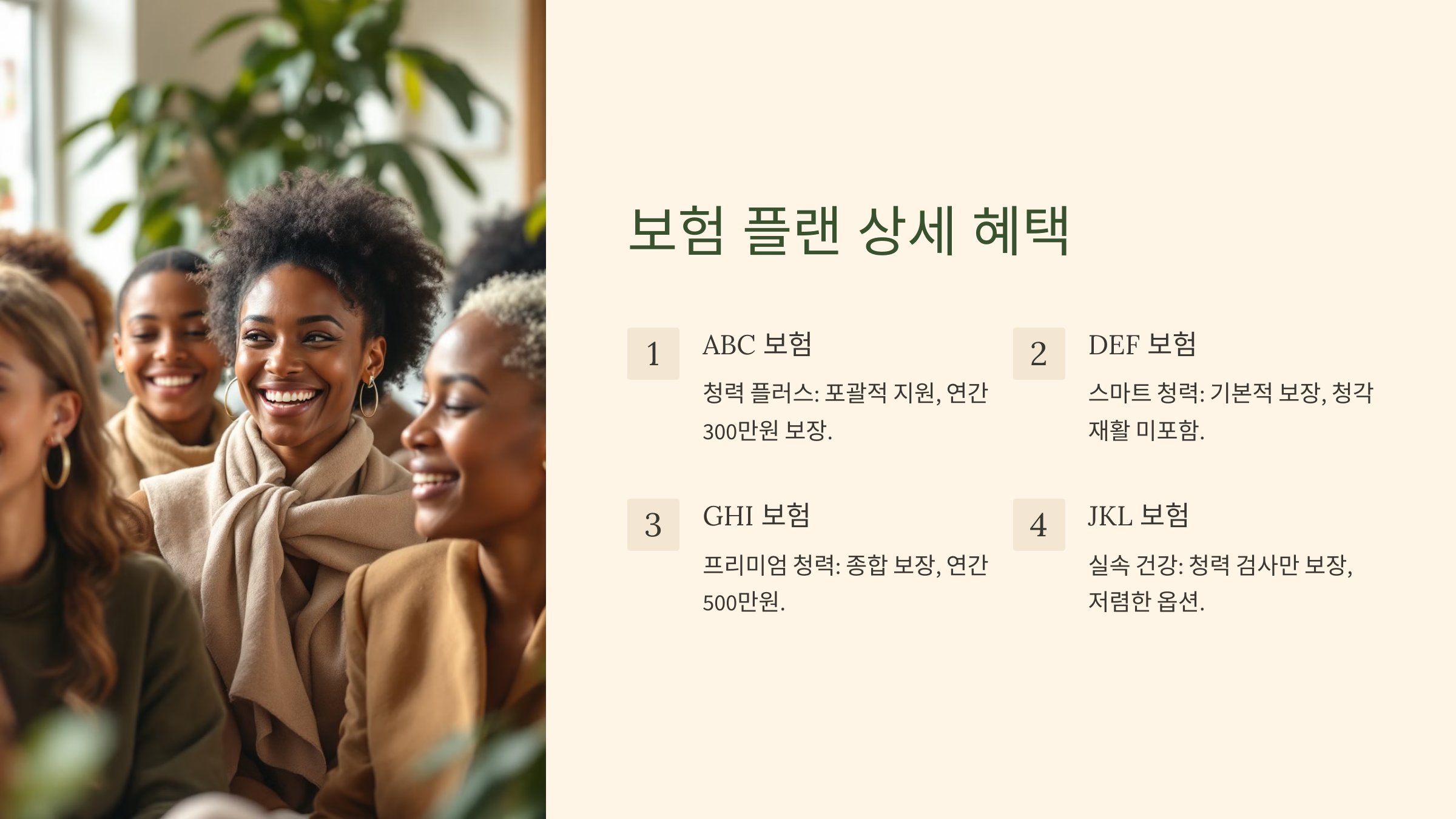 - 청각 건강 종합 보장: GHI 보험의 프리미엄 청력 보험은 모든 청력 관련 진료와 보청기, 청각 재활 치료를 지원하는 포괄적 플랜으로 연간 최대 500만 원까지 보장됩니다.