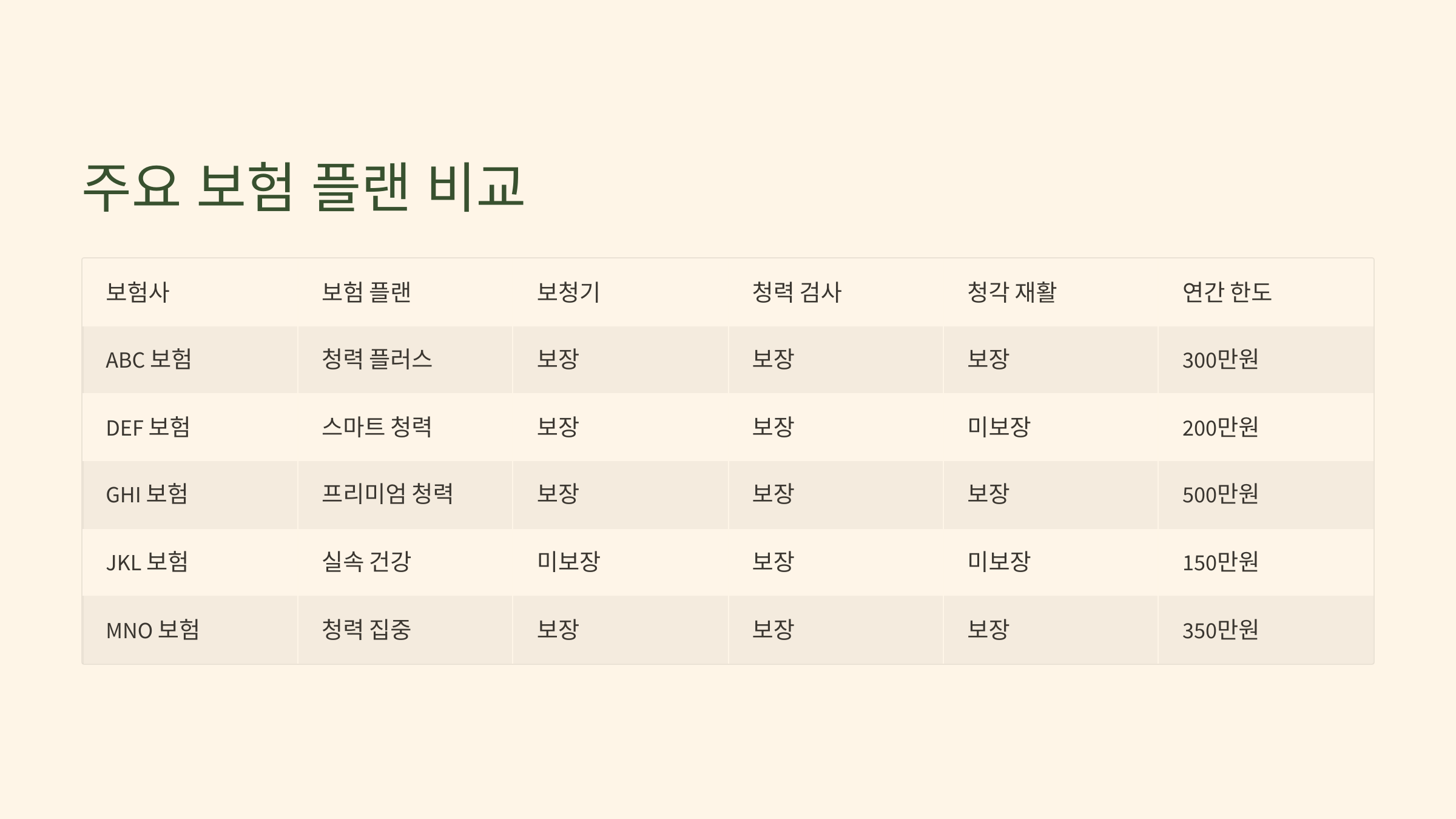 | 보험사 | 보험 플랜 이름 | 보청기 보장 여부 | 청력 검사 보장 | 청각 재활 치료 보장 | 연간 보장 한도 |