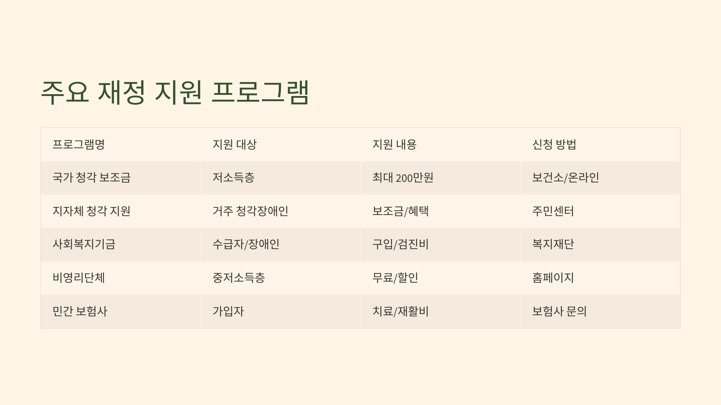 | 프로그램명 | 지원 대상 | 지원 내용 | 신청 방법 | 주요 제공 기관 |