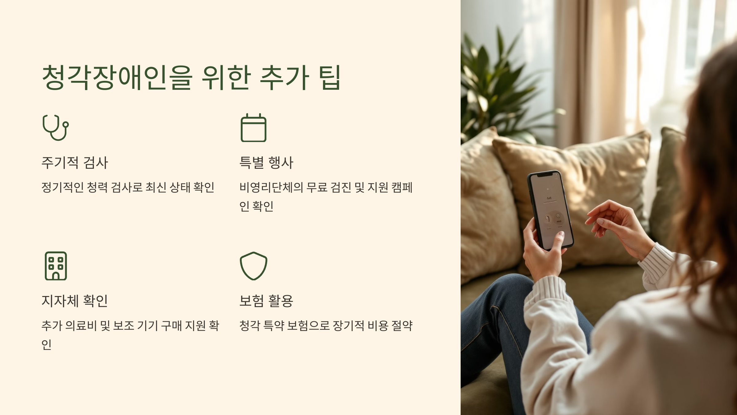 - 지자체 프로그램 추가 확인: 일부 지역에서는 추가적인 의료비 지원이나 청력 보조 기기 구매 지원을 제공하므로, 해당 지역 주민센터나 복지 포털을 통해 확인하는 것이 좋습니다.