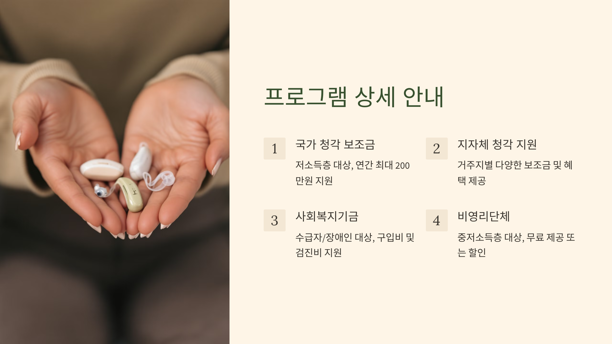 - 지원 내용: 청각 치료비와 재활 비용 보조, 청력 검사 비용까지 포함될 수 있습니다.