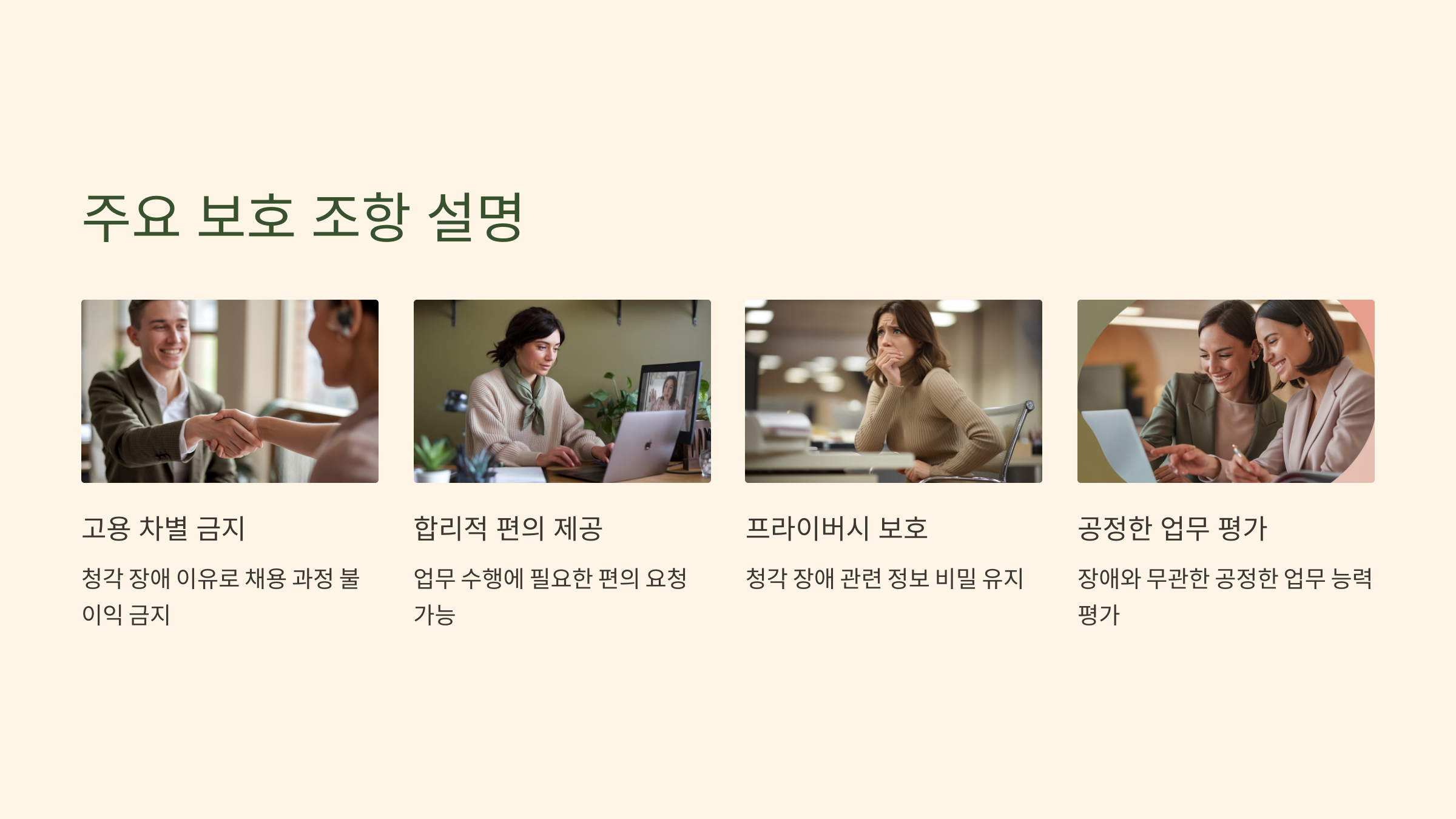 - 예시: 청각 장애인도 동일한 기준으로 승진 기회를 제공받고, 훈련과 교육 프로그램에 참여할 수 있어야 합니다.