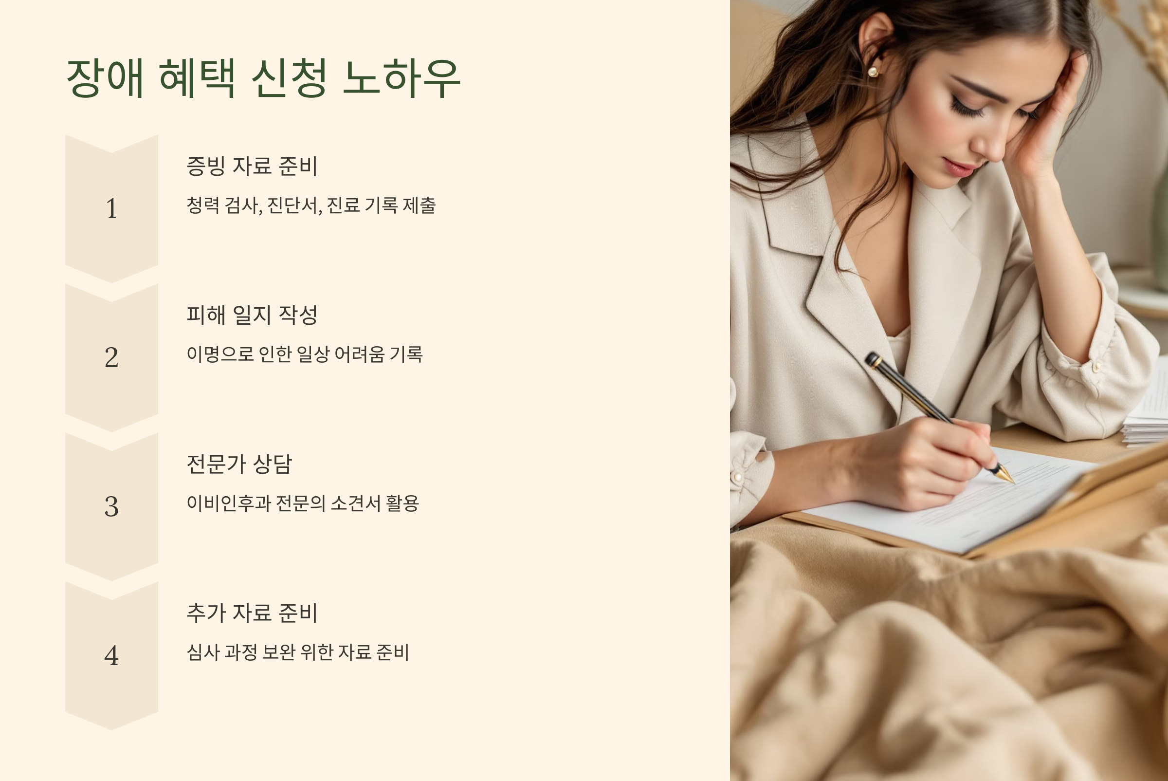 - 전문가 상담 및 소견서 적극 활용: 이비인후과 전문의나 청력 전문가의 소견서를 통해 이명의 지속성과 그로 인한 피해를 강조하는 것이 좋습니다. 이러한 자료는 신청 승인에 큰 도움이 됩니다.