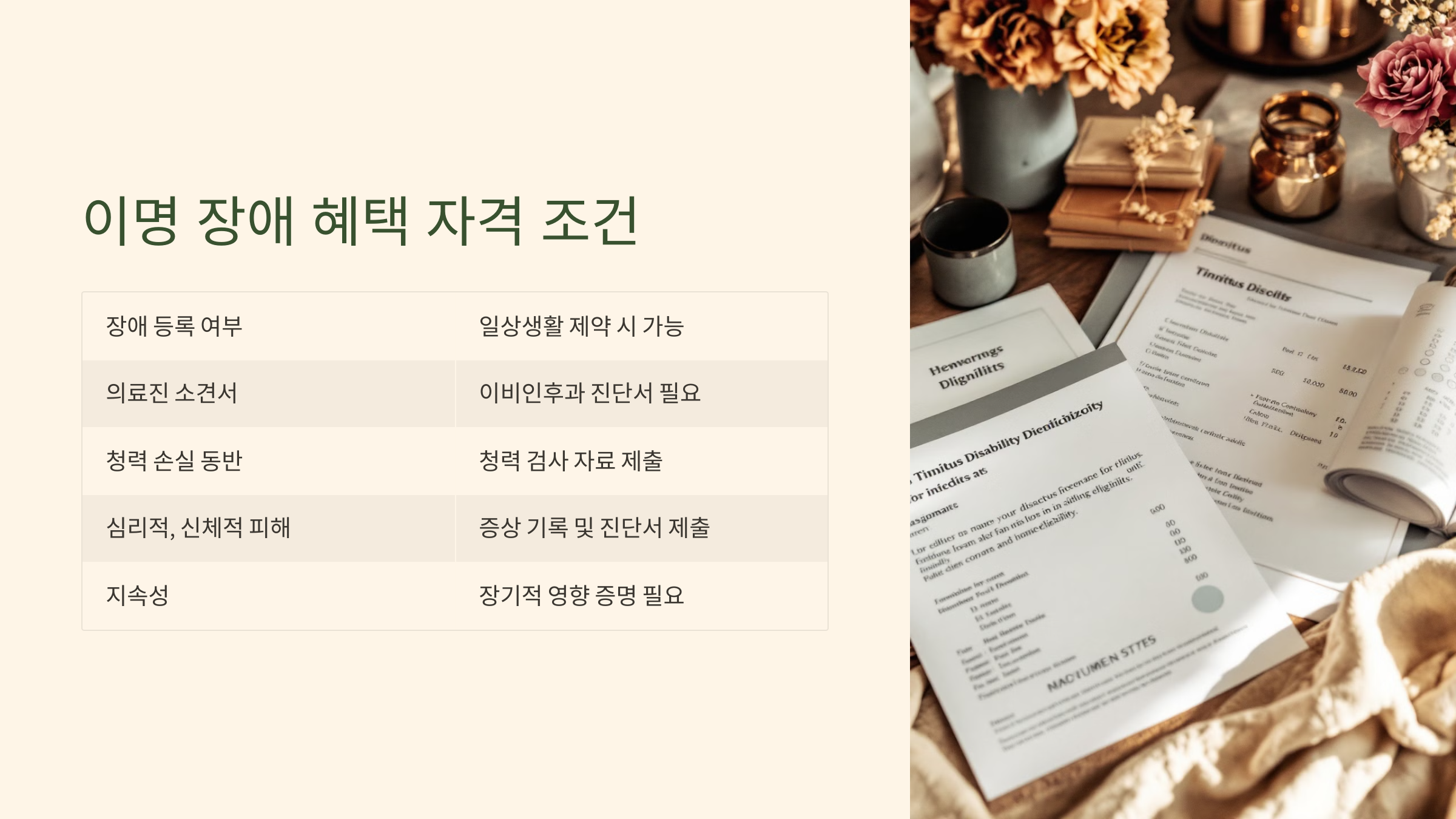 | 일정 수준 이상의 지속성 | 이명이 지속적이거나 일상 생활에 방해가 될 때 | 장기적인 장애 등록 가능성 | 진단서와 함께 지속 기록 필요 |