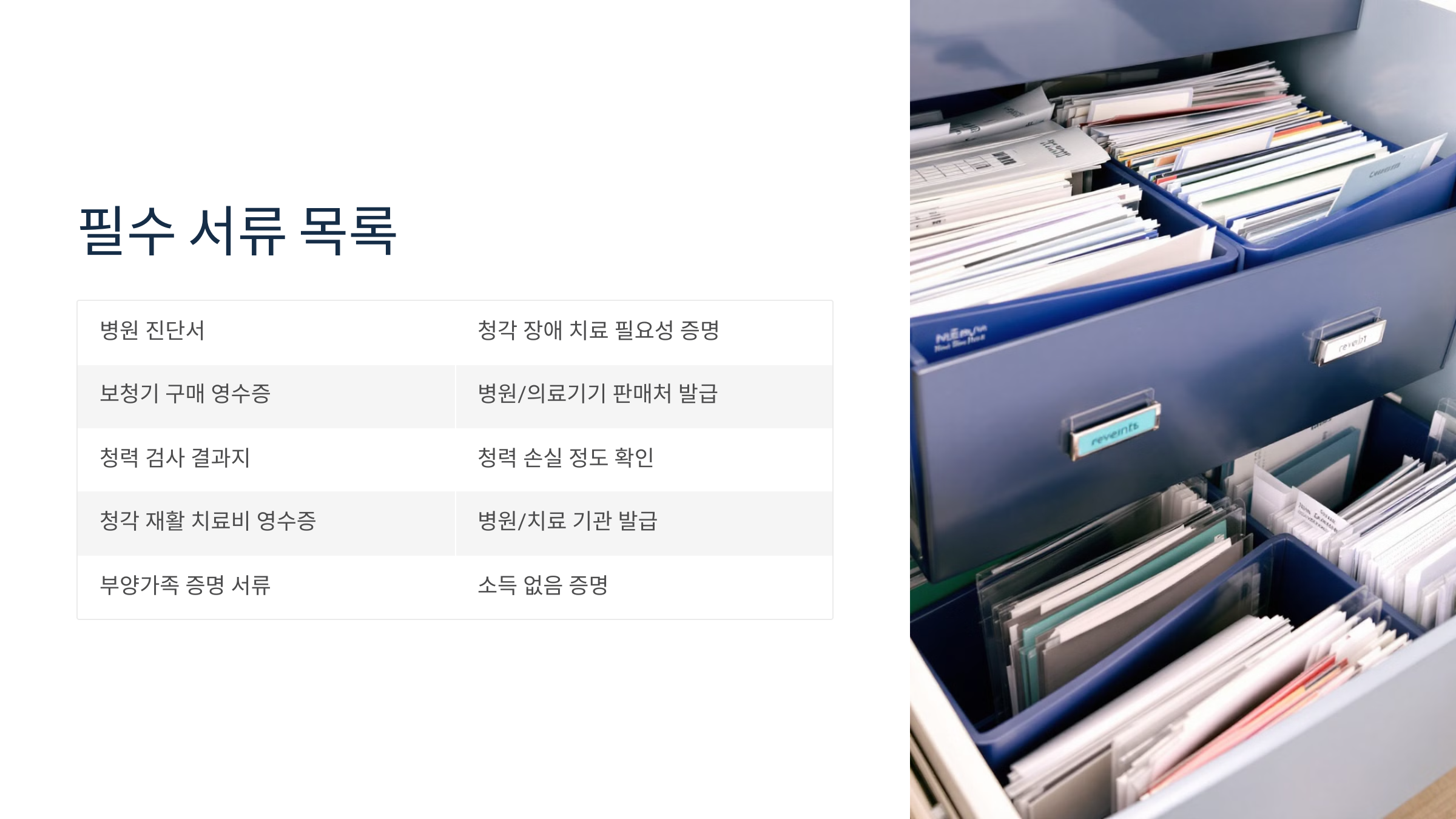 | 항목별/가족별 분류 | 병원 진단서, 청력 검사 결과지, 보청기 영수증 등을 항목별로 분류하여 보관합니다. |
