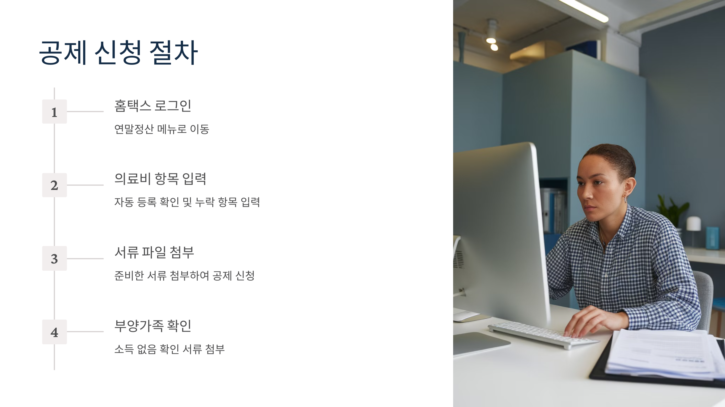 - 소득이 없는 부양가족 확인: 부양가족의 경우 소득이 없음을 확인할 수 있는 서류를 첨부하여 신청합니다.
