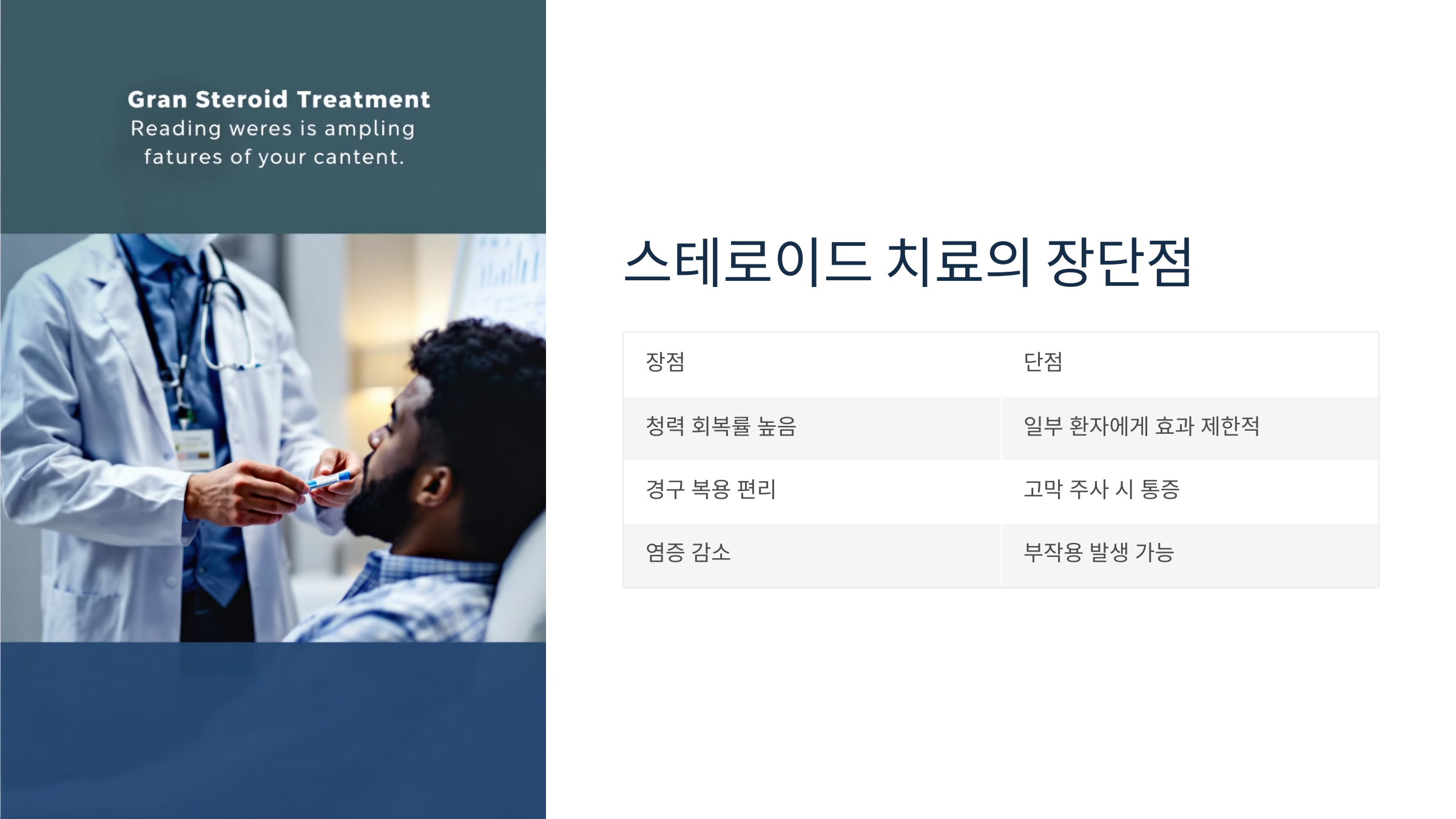 스테로이드 치료는 청력 회복에 효과적이지만, 환자의 상태와 부작용 가능성을 고려해야 합니다. 경구 복용은 비용이 적게 들고 편리한 반면, 고막 주사는 청력 회복이 빠른 장점이 있지만 비용이 더 많이 소요될 수 있습니다. 따라서 각자의 상황과 건강 상태에 맞추어 신중히 결정하는 것이 좋습니다.
