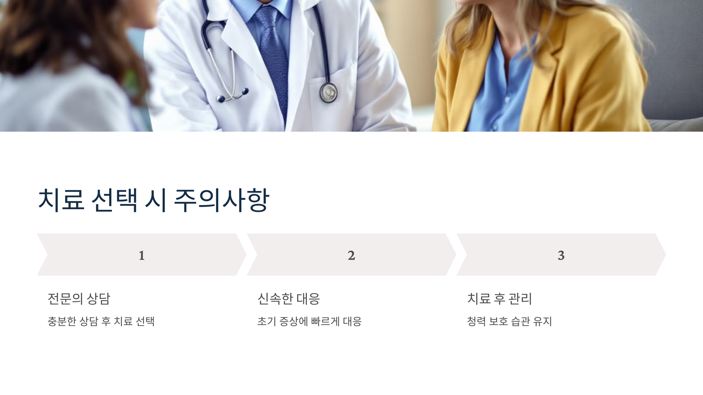 치료 후 청력을 보호하기 위한 습관을 유지하는 것도 중요합니다. 소음이 많은 환경을 피하고, 청력 회복을 위한 적절한 휴식을 취하는 것이 필요합니다.
