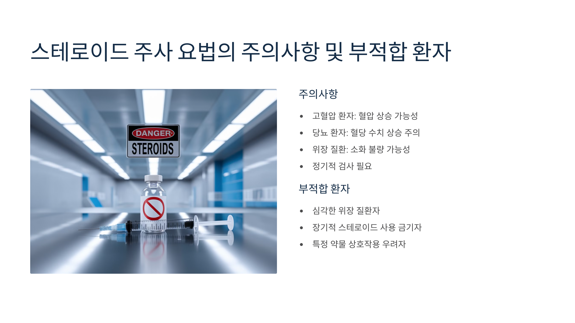 - 스테로이드 주사 요법의 주의사항 및 부적합 환자