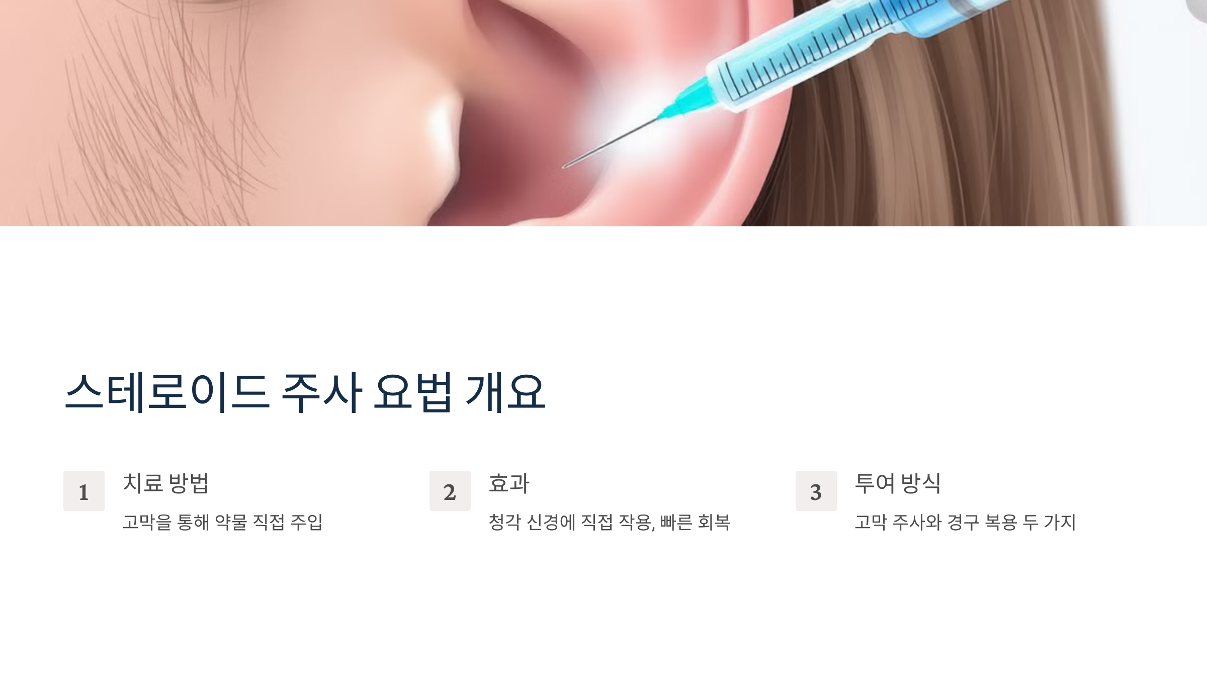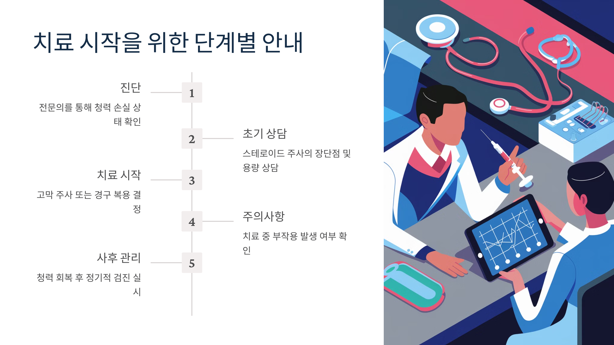 | 3. 치료 시작 | 고막 주사 또는 경구 복용 결정 | 주사 방법은 효과 빠르지만 통증 동반 |